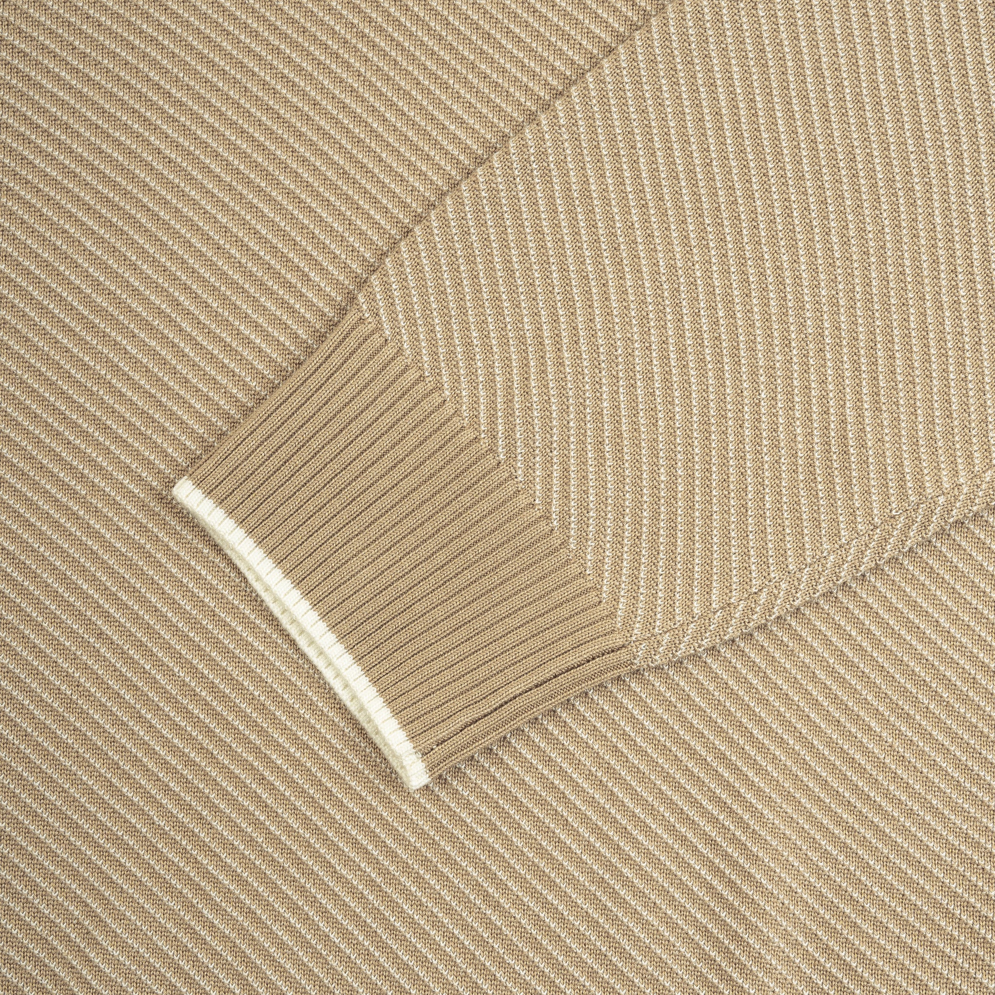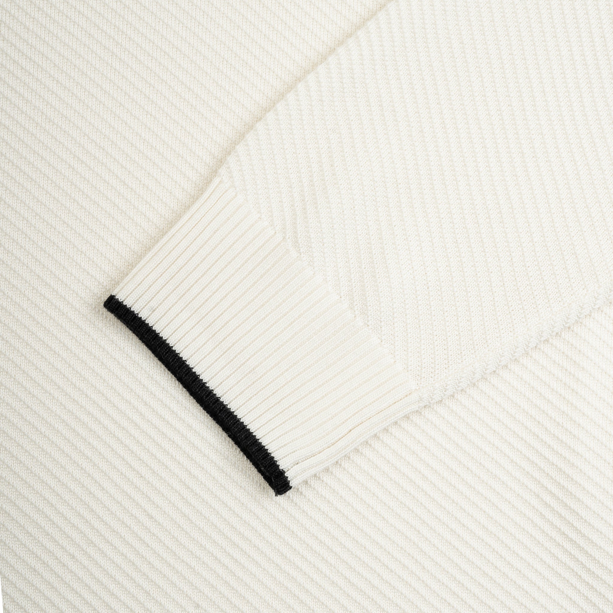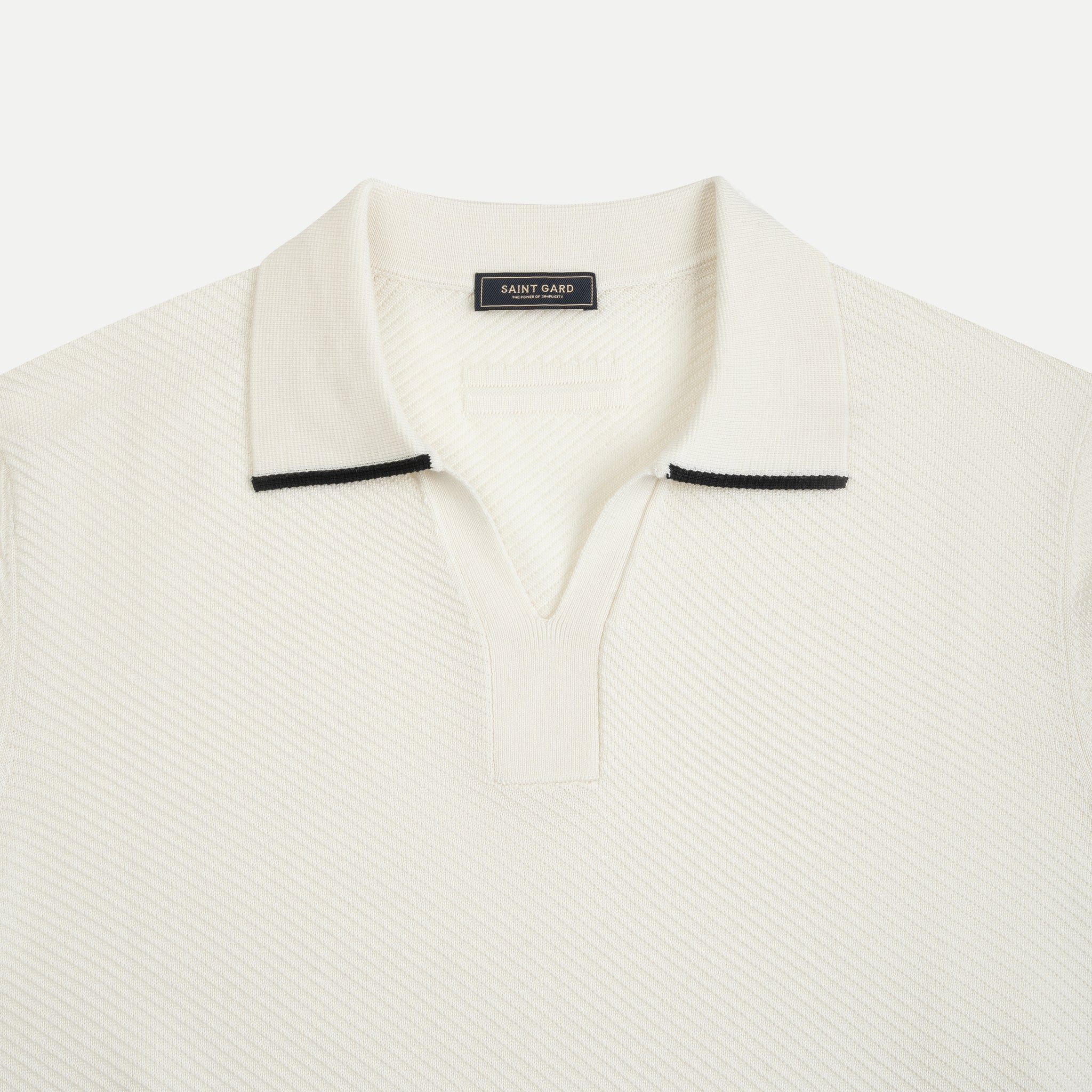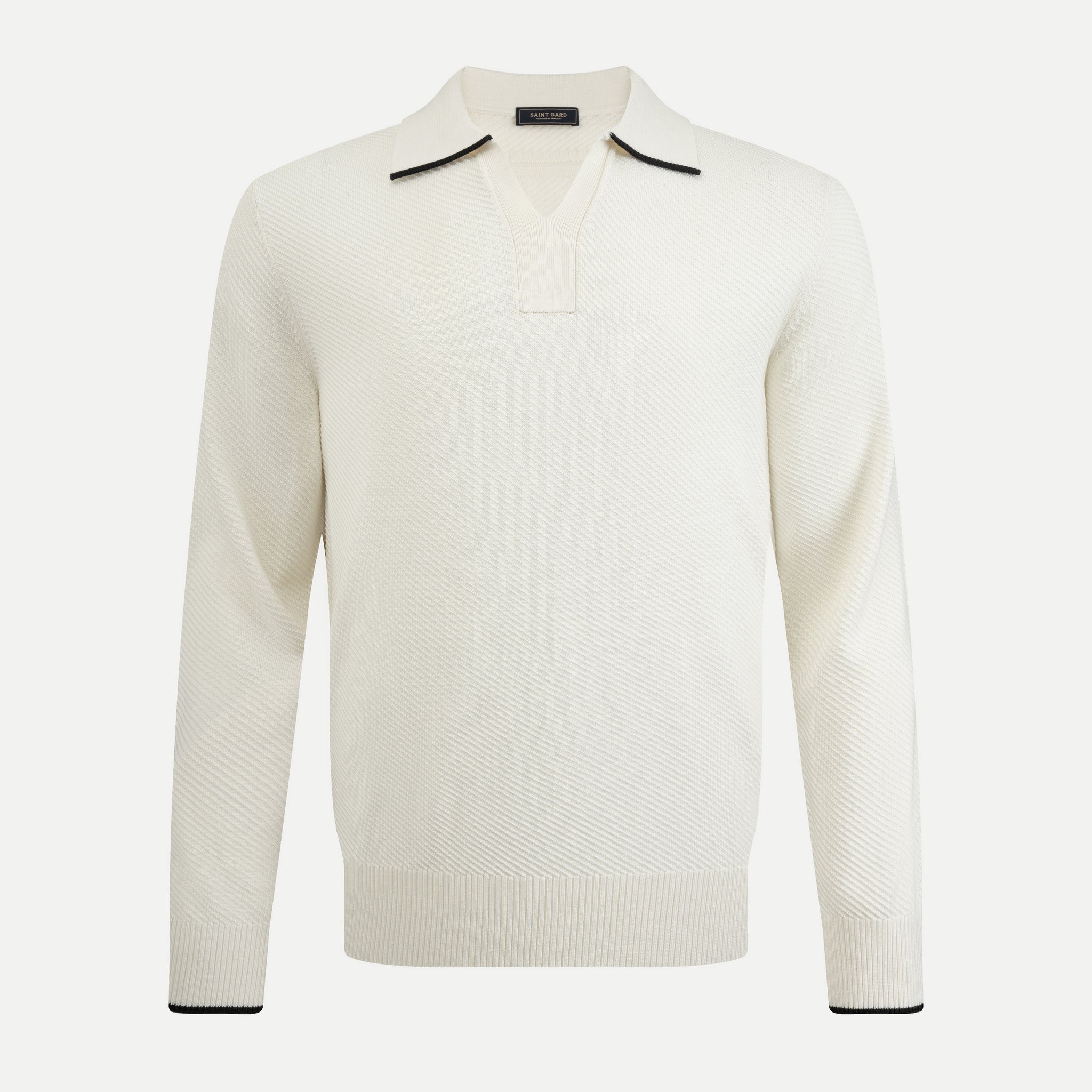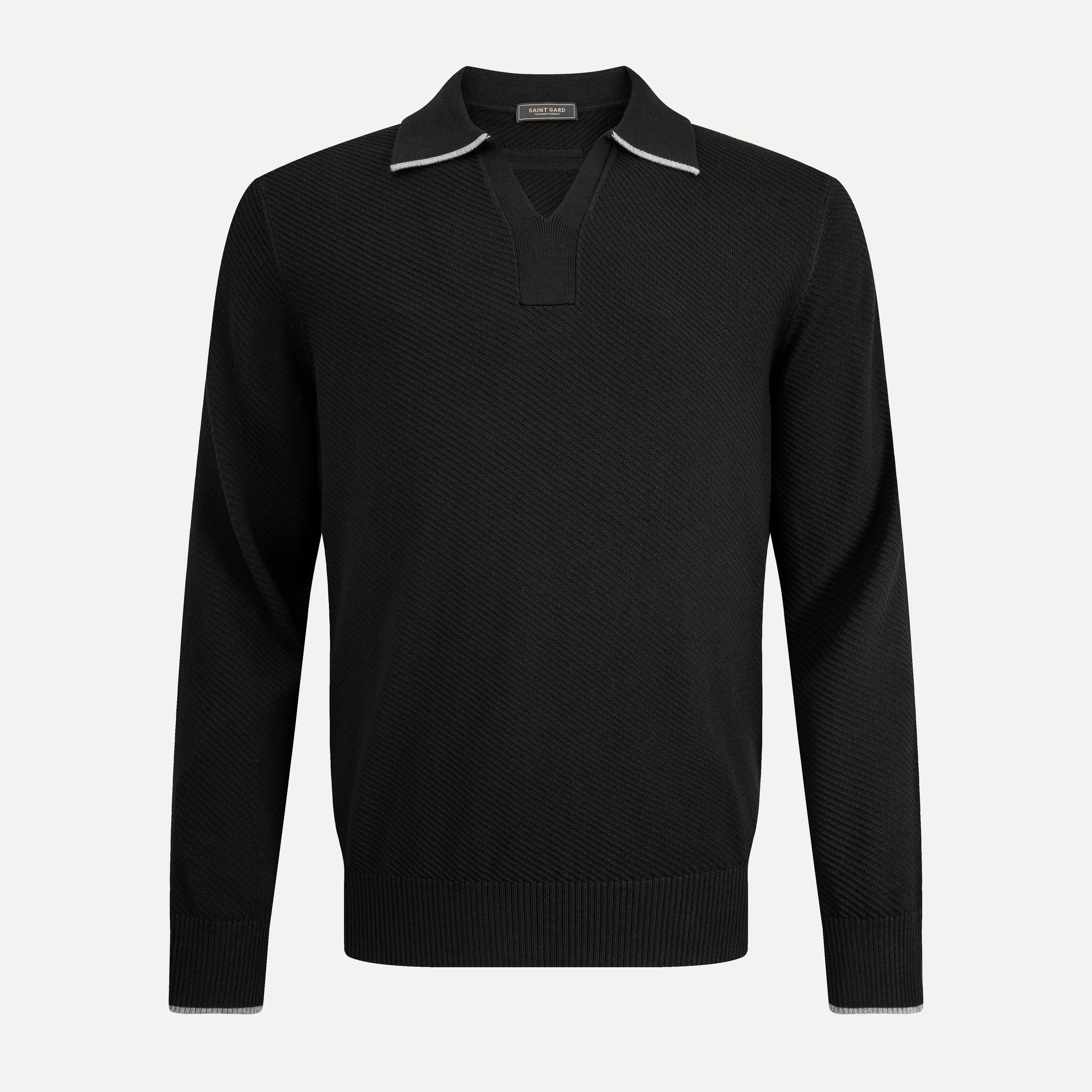 Áo Polo dài tay acrylic chống xù có thiết kế cổ chân V thấp mang đến vẻ ngoài hiện đại và thoải mái, bo viền bằng vải len gân tinh tế.