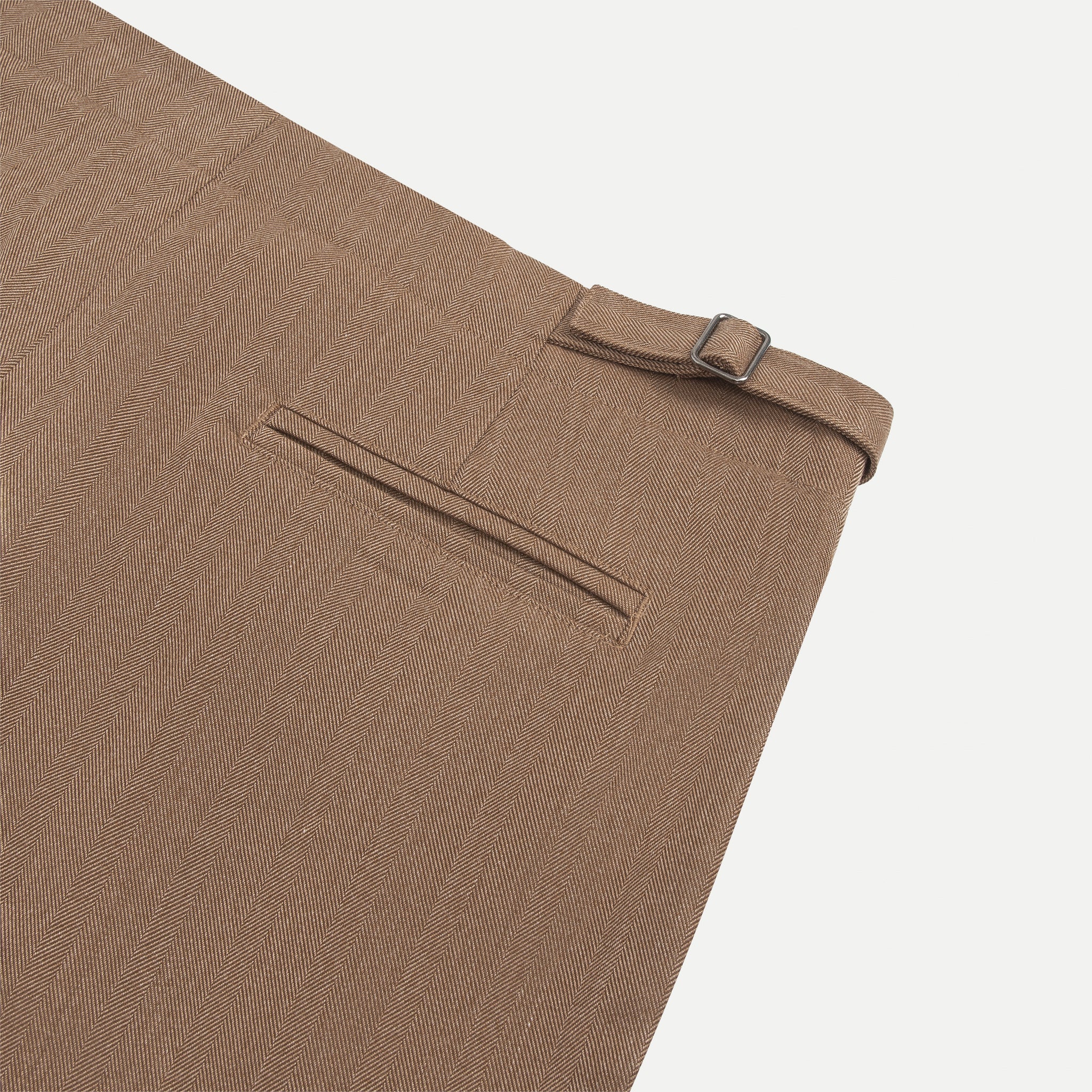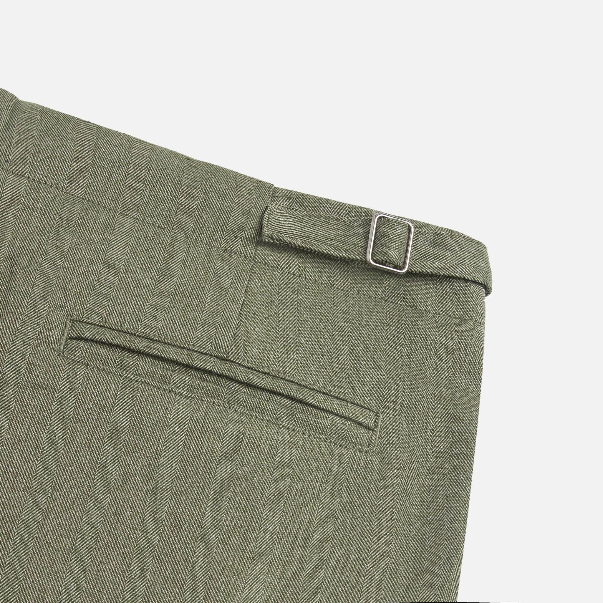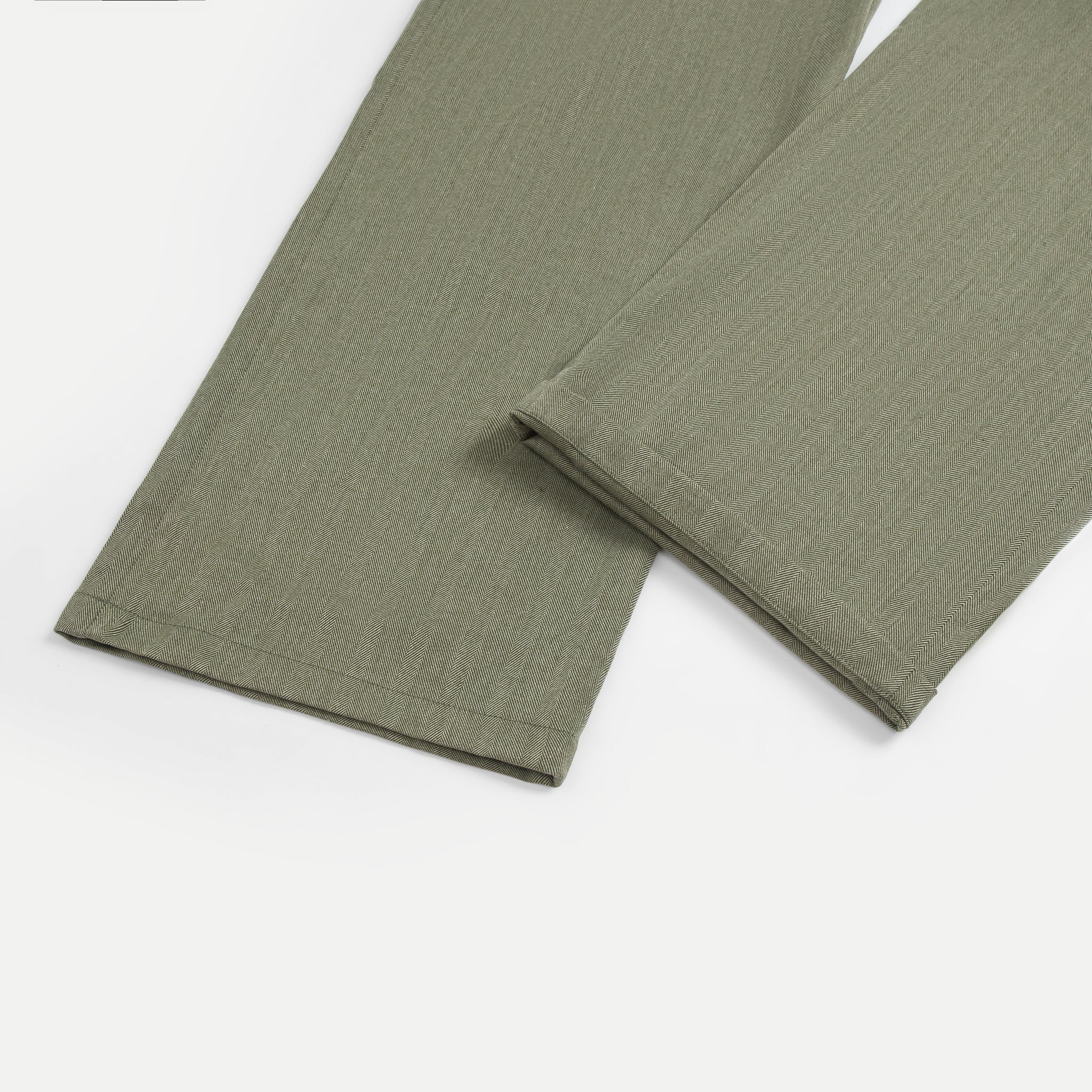 Vải dệt herringbone có đặc tính nổi bật là hoạ tiết zigzag đặc trưng giống xương cá, tạo nên vẻ ngoài thanh lịch và cổ điển. Chất liệu này chắc chắn, bền bỉ, có khả năng chống mài mòn tốt, đồng thời mềm mại, ít xù lông và giữ màu lâu. Ngoài ra, vải herringbone còn có độ rủ tốt, dễ ủi