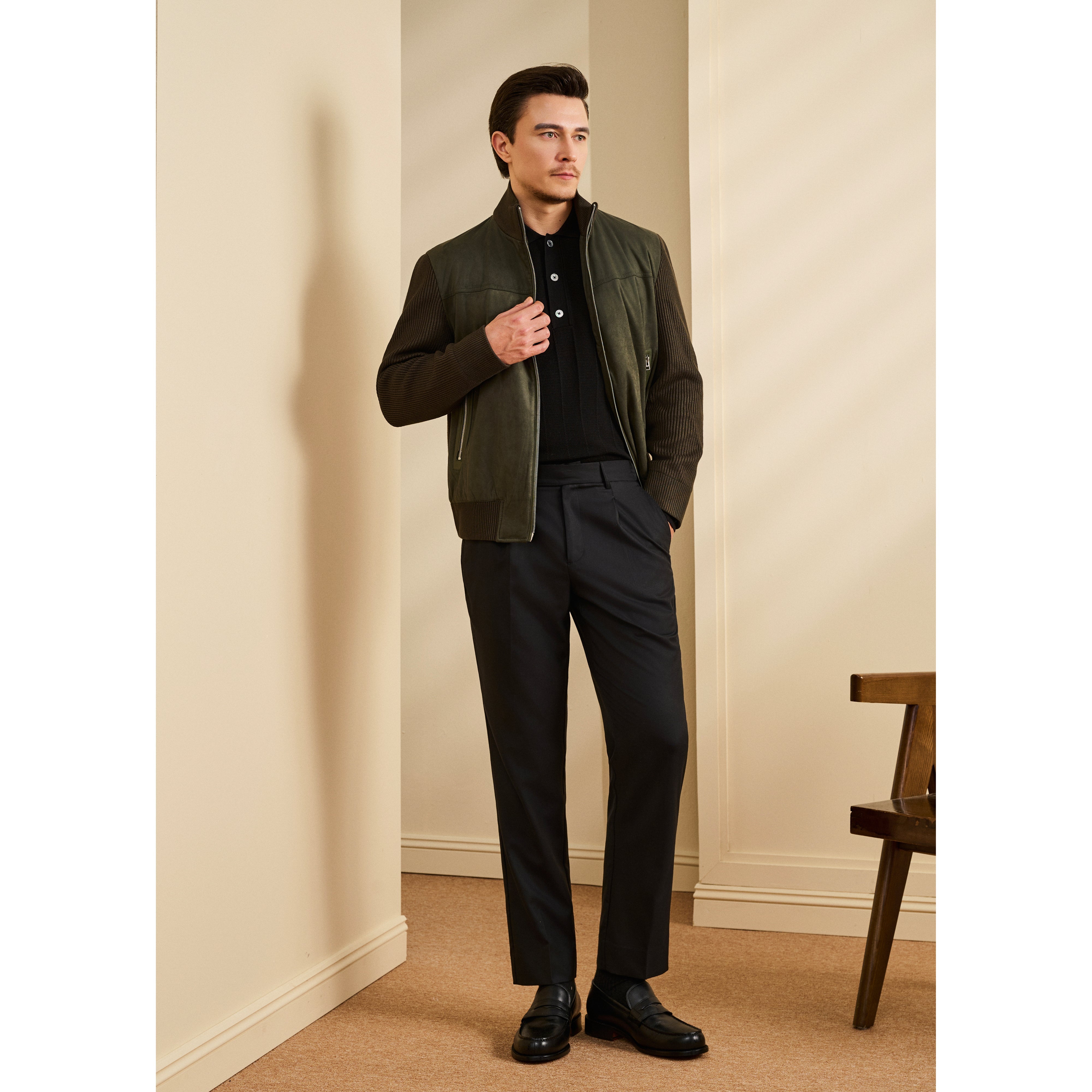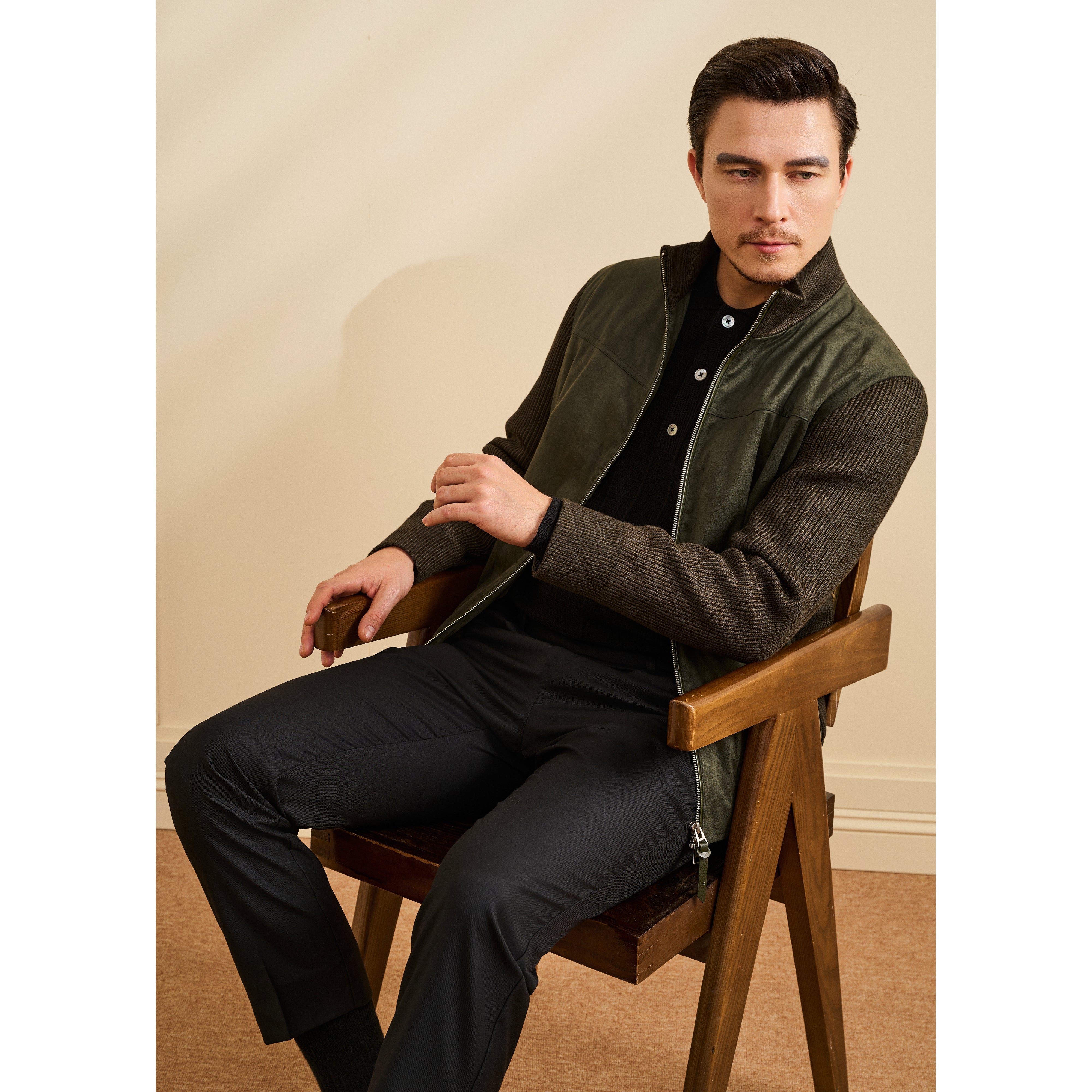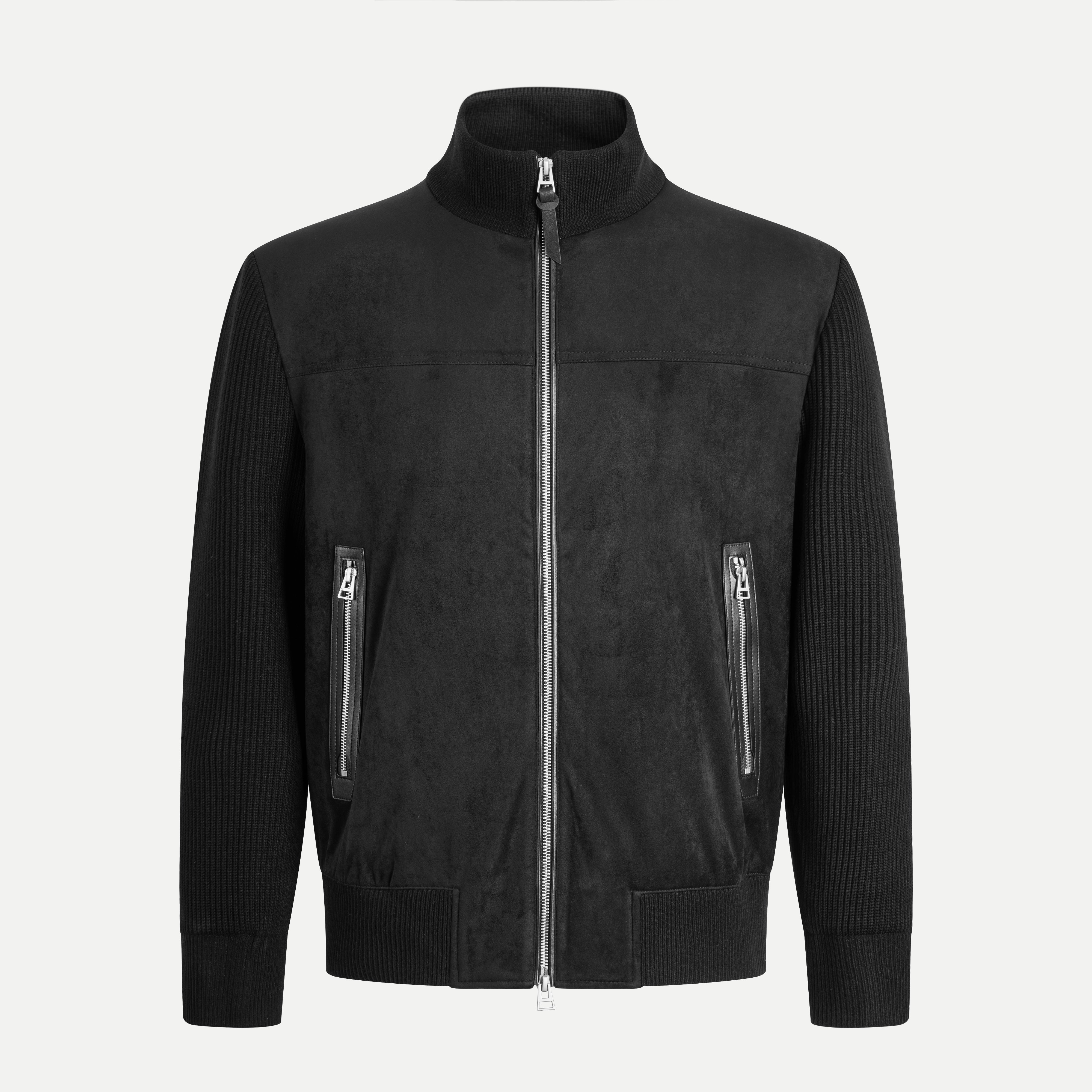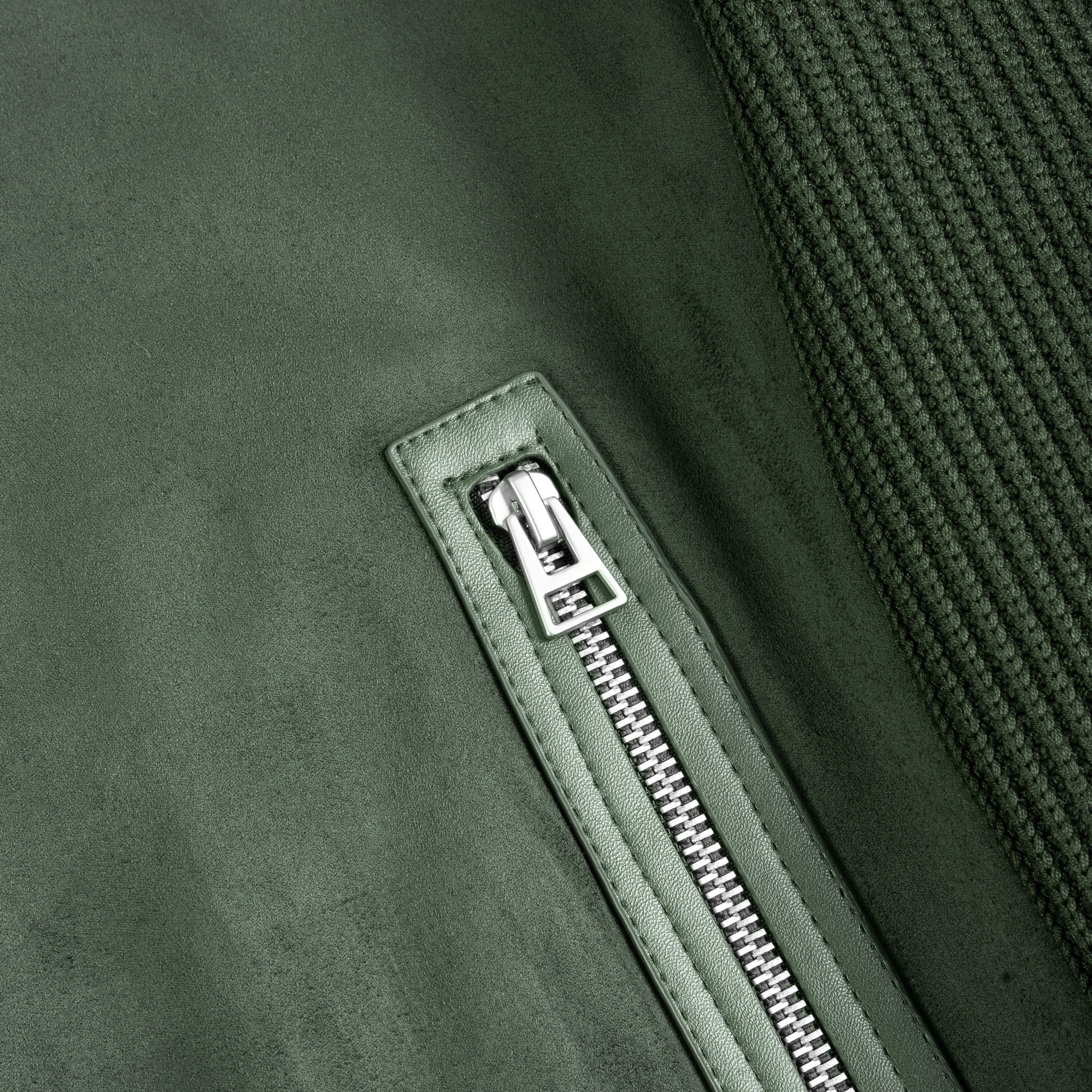 Suede & Knit Zip Jacket with Stand Collar delivers a modern, elevated outerwear look with refined detailing and functional comfort. Designed with a clean stand collar and a sleek front zip closure, this jacket features two vertical zip pockets for secure storage and a streamlined silhouette.