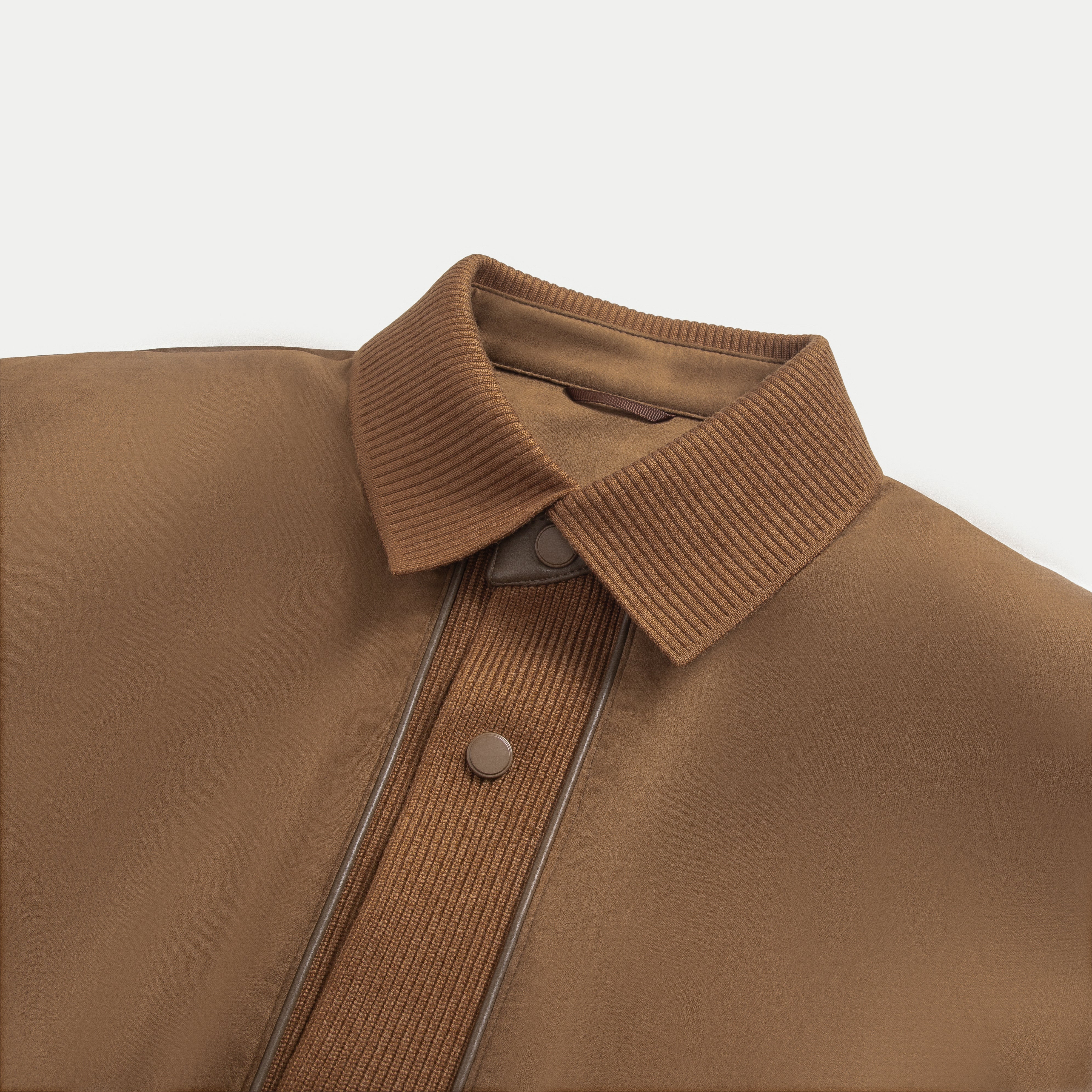 Distinguished by a fold-down collar and knitted sleeves, the design introduces an elegant contrast that elevates its overall aesthetic. With a gently contoured fit that enhances the figure without restricting mobility, the jacket reflects meticulous attention to material quality, harmonious color tones, and precise craftsmanship.