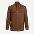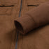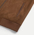The jacket is crafted from premium suede, featuring a smooth, velvety surface that feels soft and comfortable to the touch.