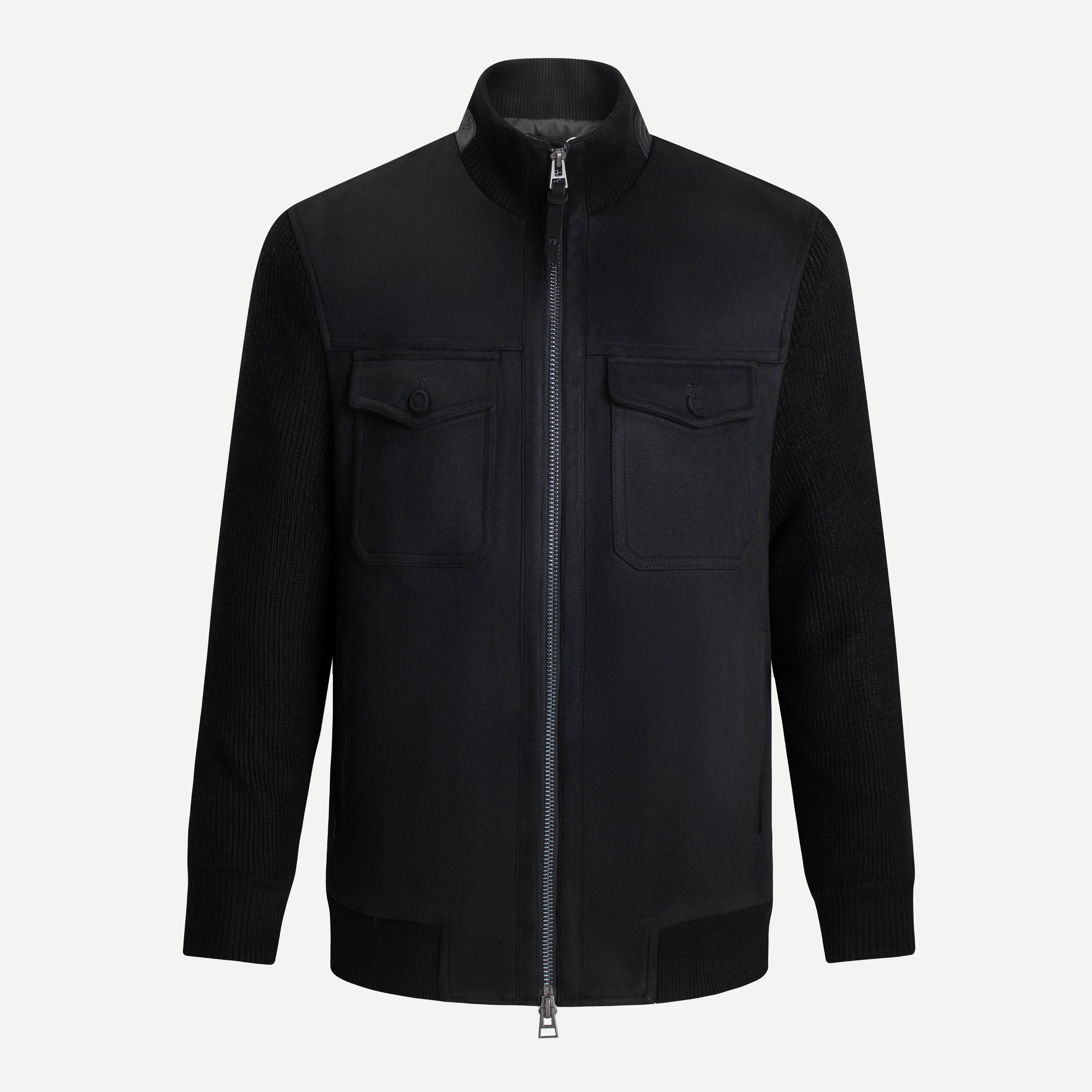 The lightly ribbed collar and fitted sleeves are complemented by a concealed metal zip closure and minimalist side pockets, enhancing the clean and modern appearance. Attention to detail is evident in the quality materials, harmonious color tones, and precise stitching. The design emphasizes comfort and flexibility, blending elements of classic sporty style with the timeless elegance suited for the modern gentleman.