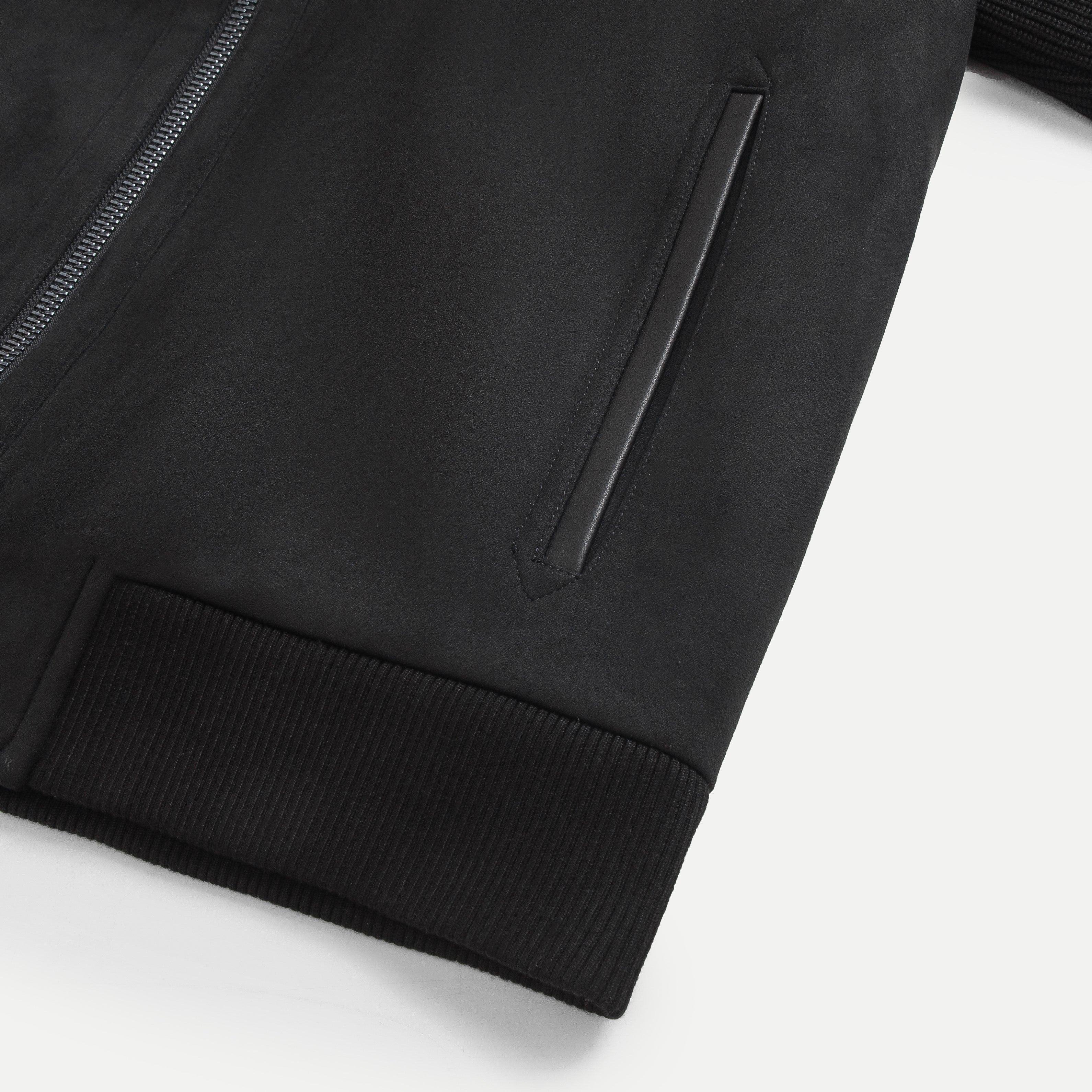 Premium Suede Blouson Jacket with Knit Sleeves features a blouson silhouette with a stand collar, delivering a minimalist, refined, and easy-to-wear aesthetic. The standout detail of this design lies in the combination of a premium suede body with high-quality knit sleeves and collar, creating an interesting interplay between structured texture and soft movement.