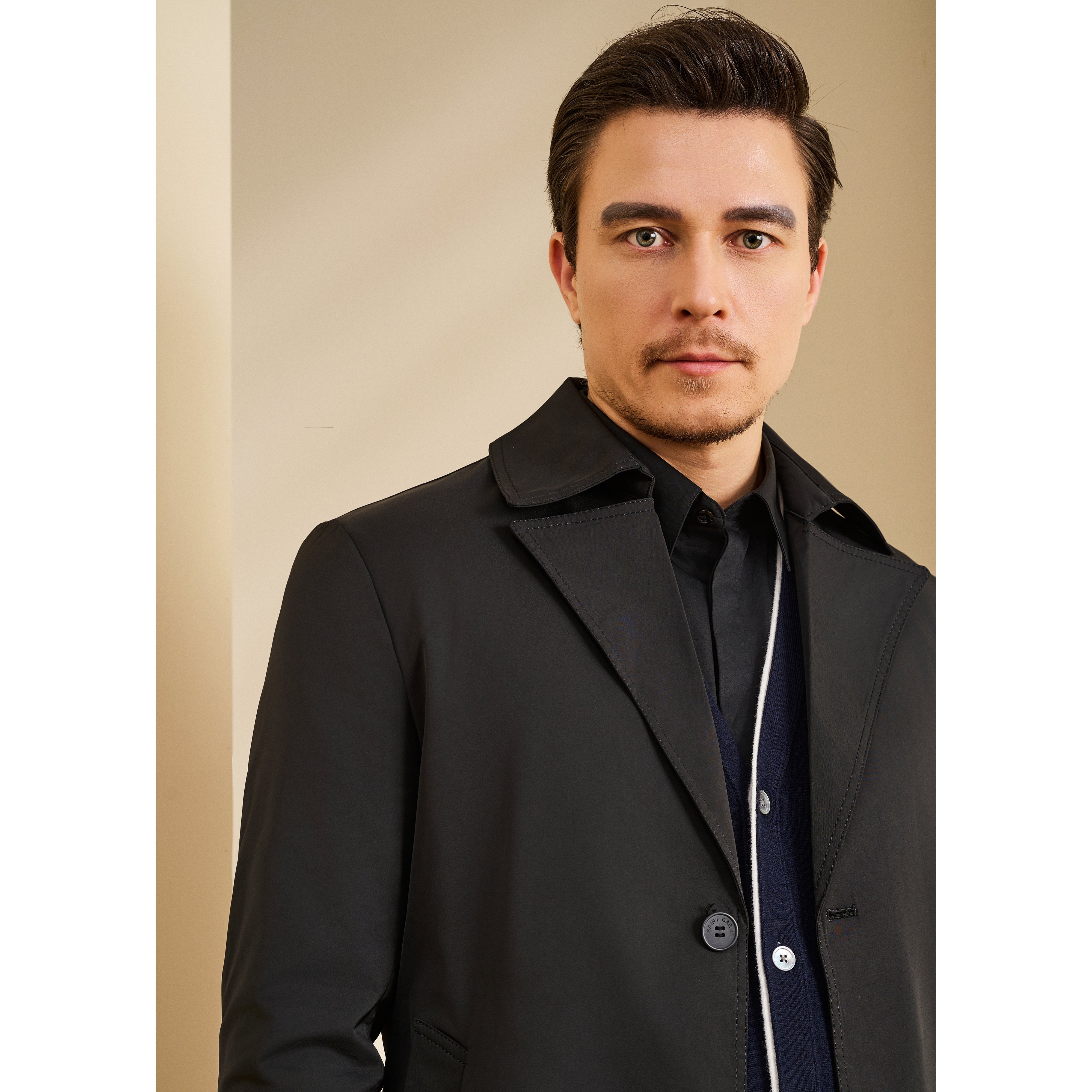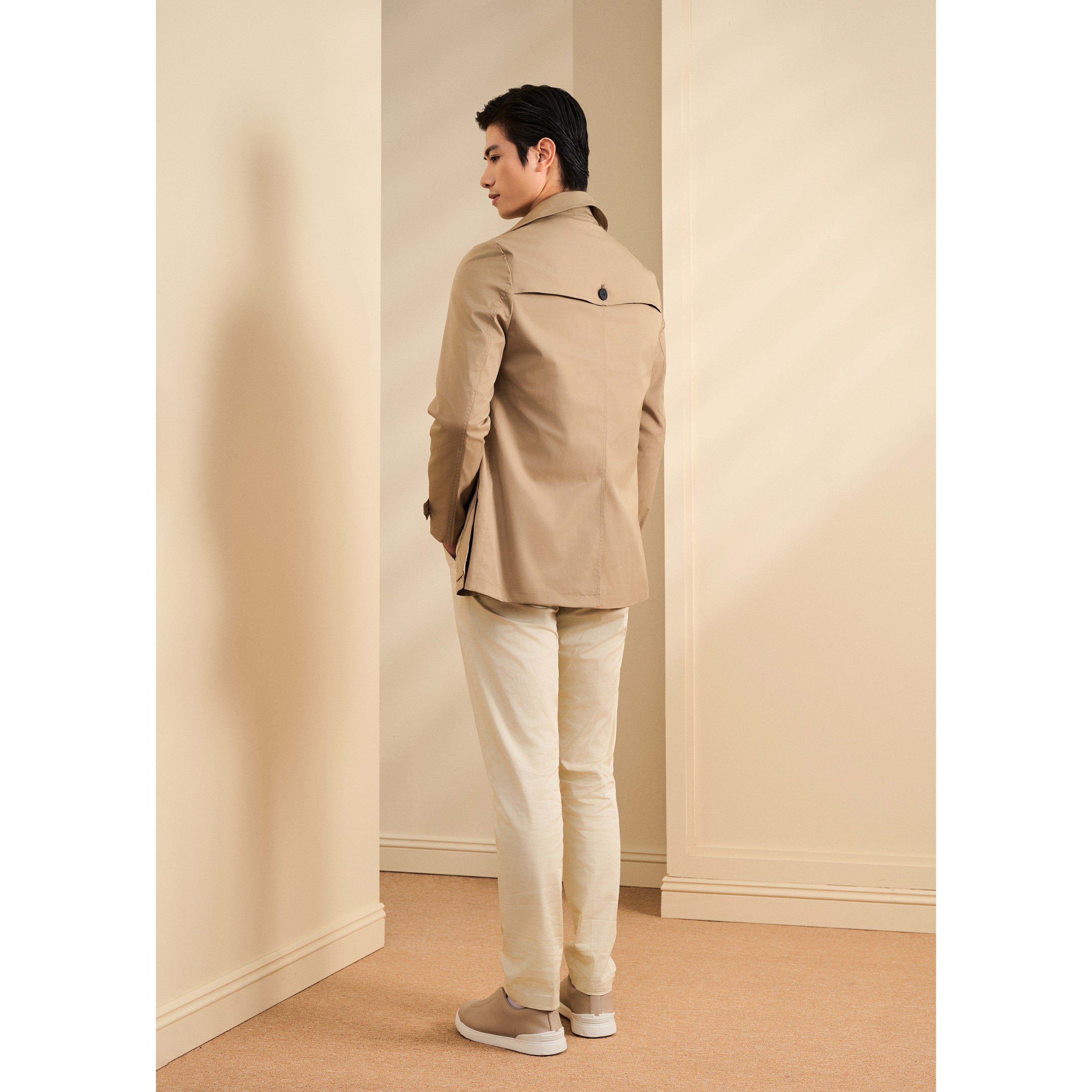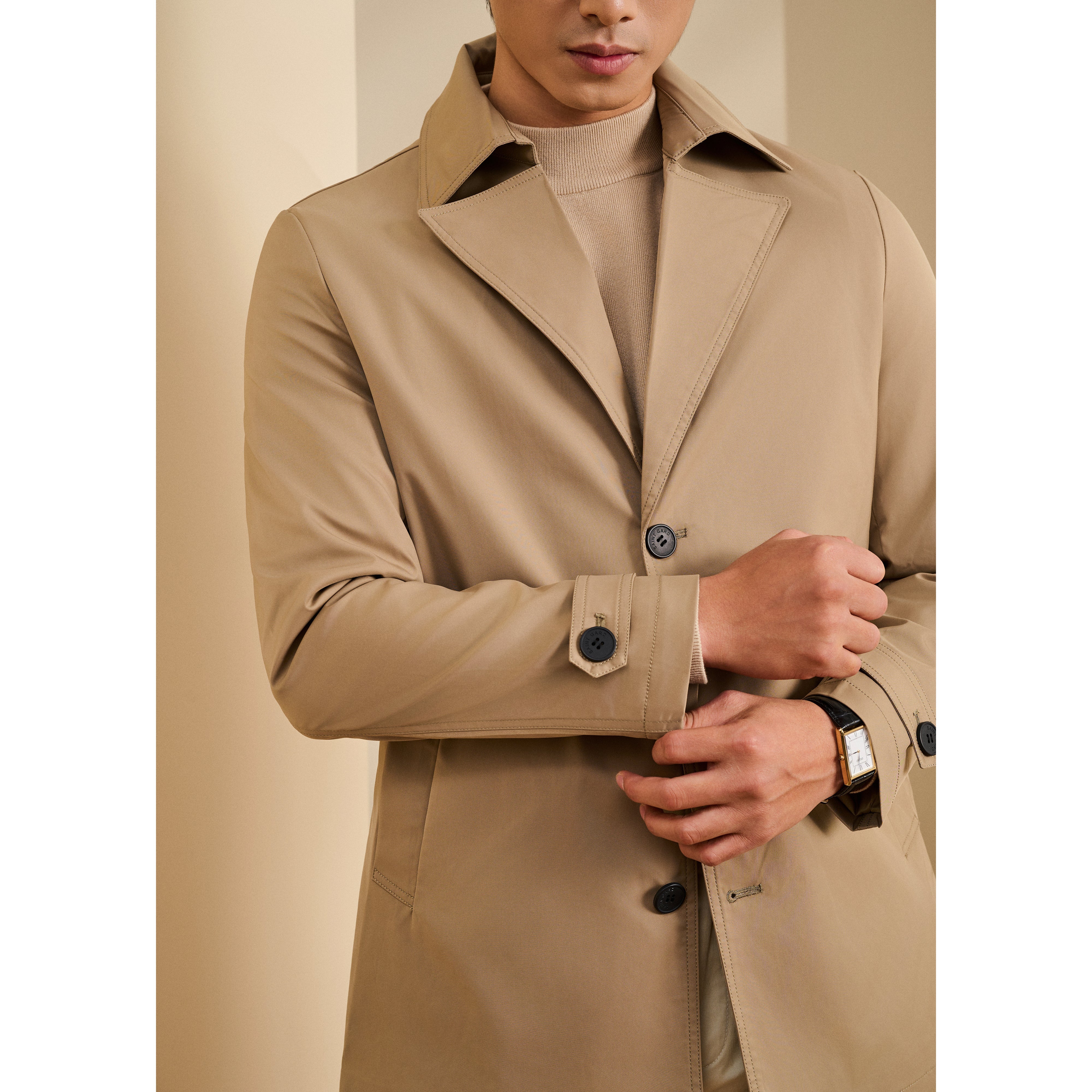 - The coat is crafted from smooth textured wind-resistant khaki fabric, offering both functionality and a refined surface finish.