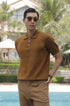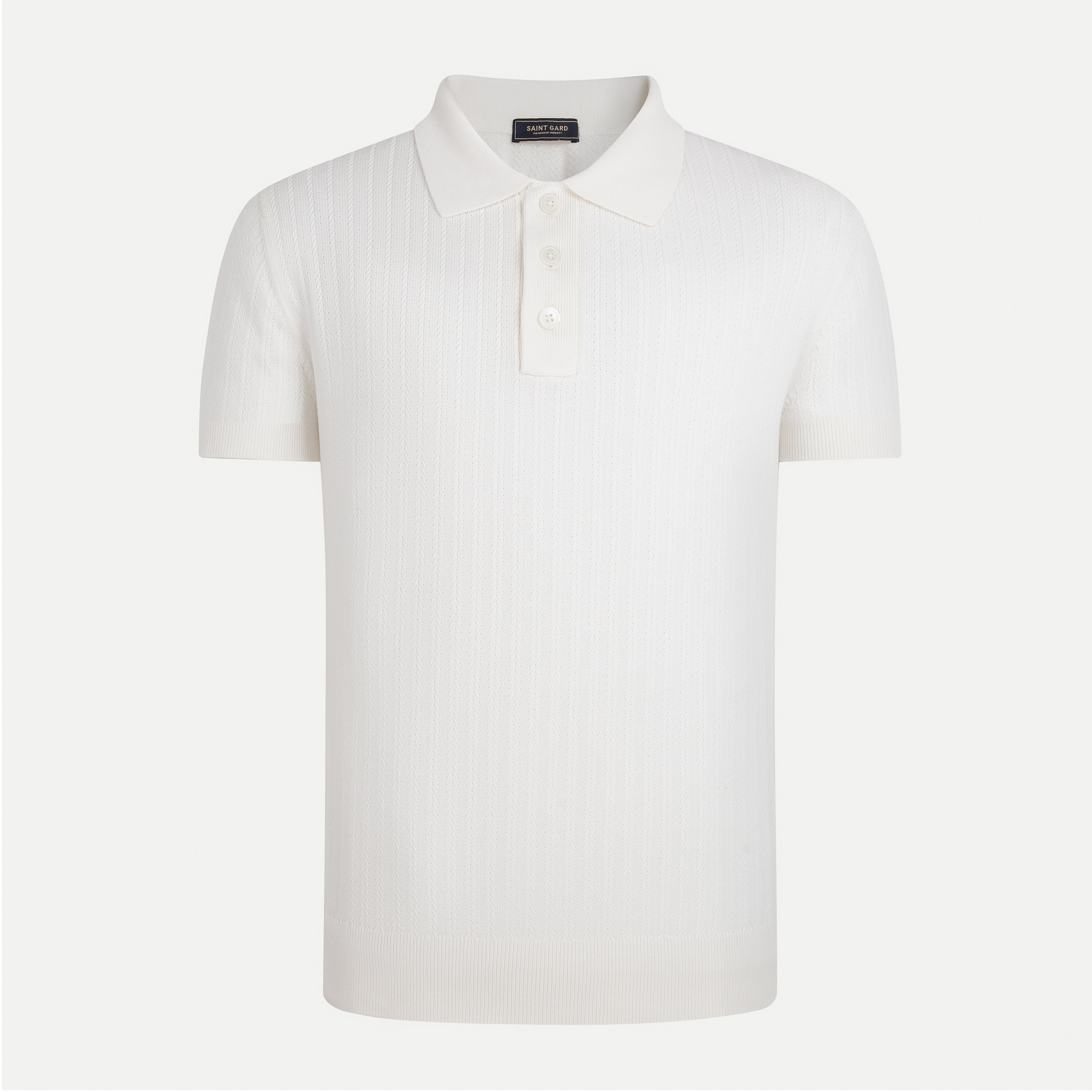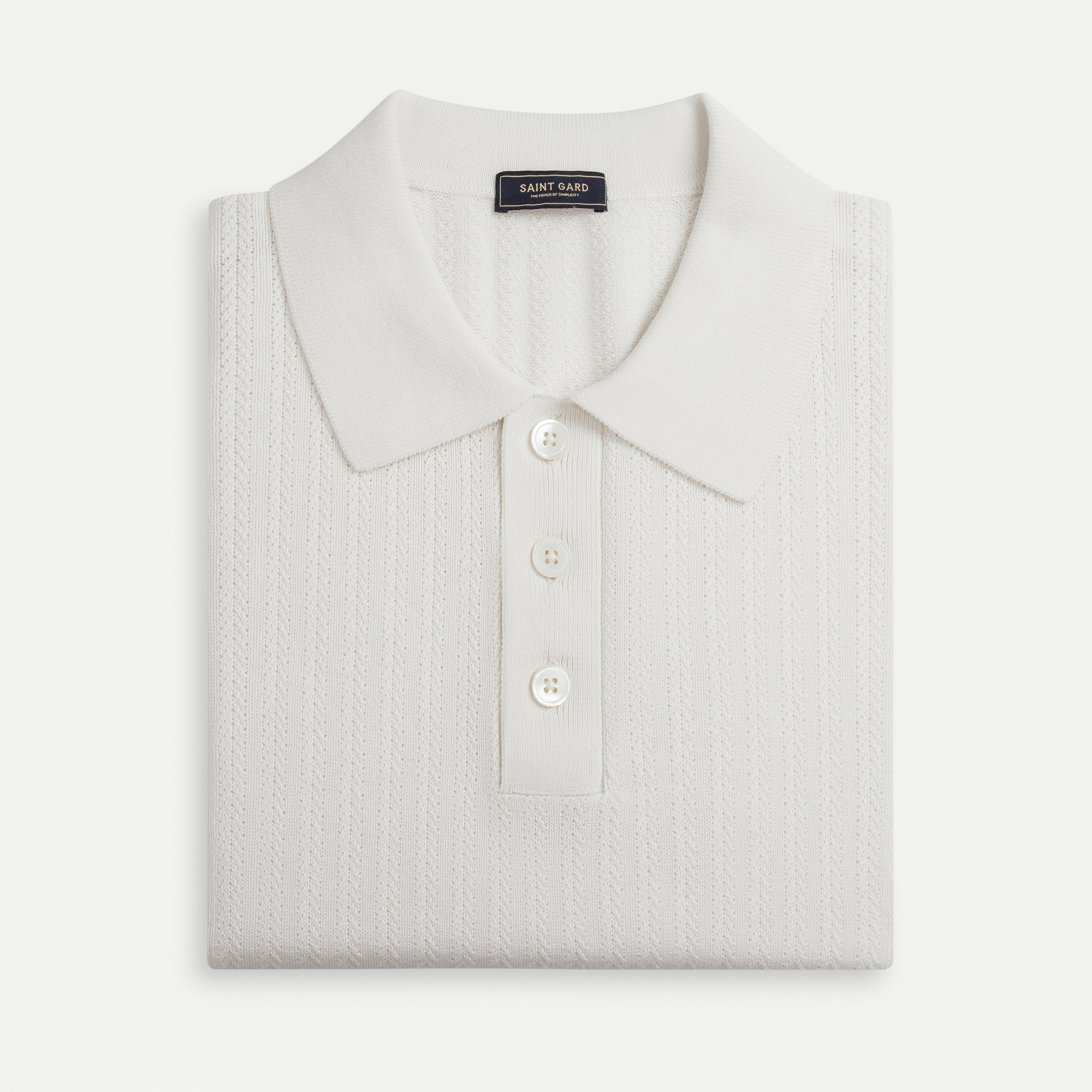 Featuring a classic fold-down collar with delicate edging, this polo is elevated by premium mother-of-pearl buttons that add a subtle luxury statement. The raised Chevron knit pattern—symbolic of strength and structure—brings depth and character while maintaining a timeless, versatile aesthetic suitable for both everyday occasions and semi-formal settings.