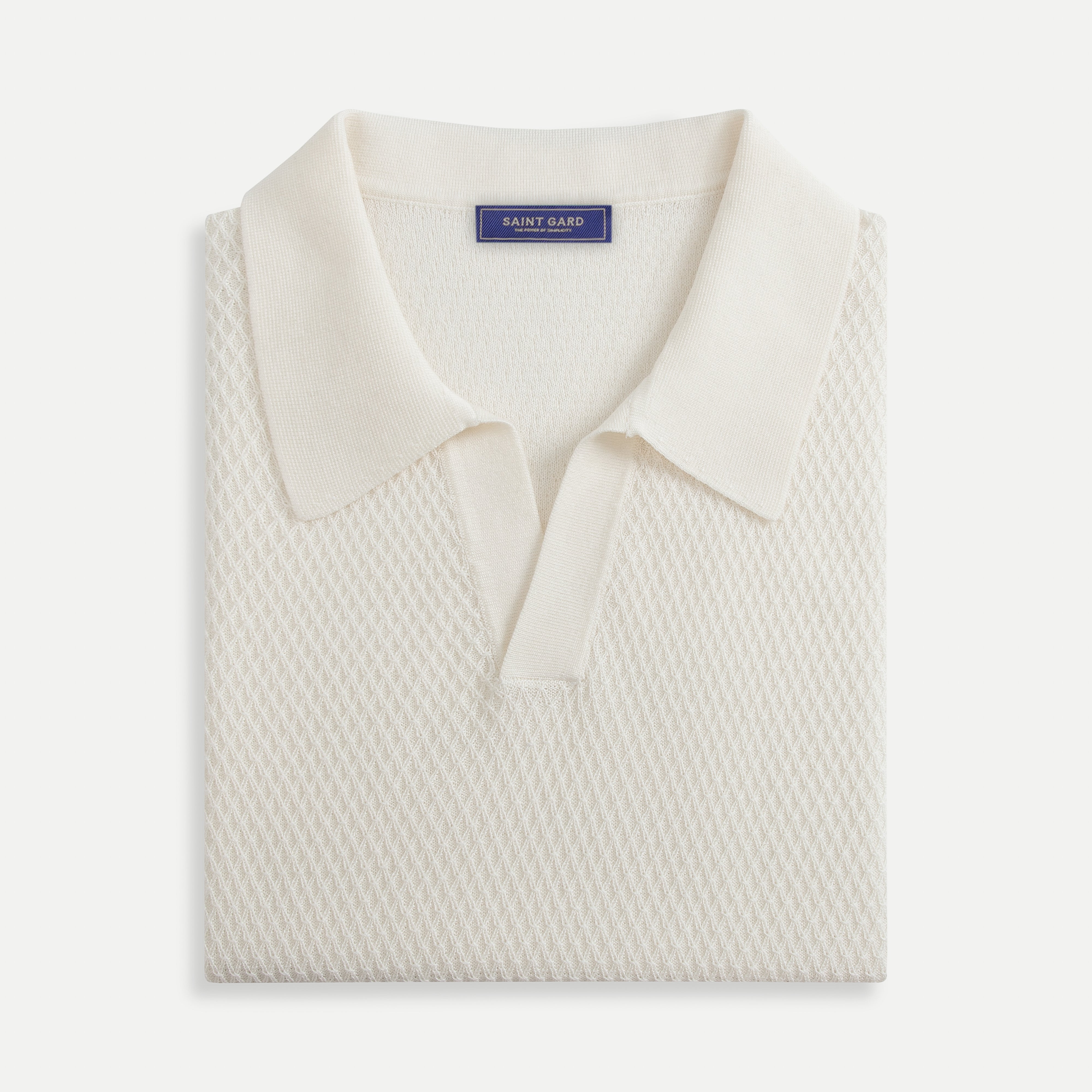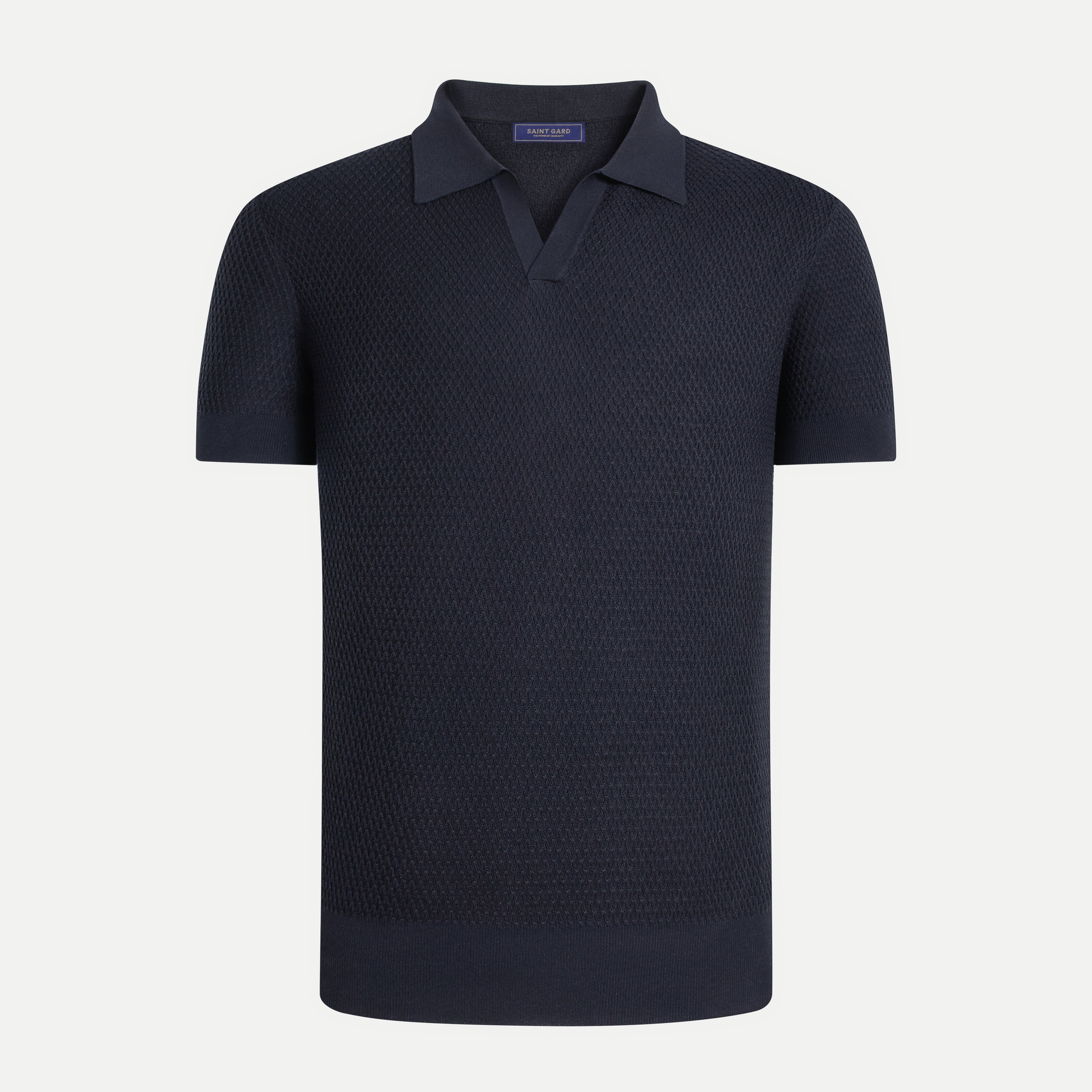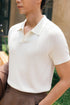 Designed with a classic fold-down polo collar, short sleeves, a refined button placket, and ribbed sleeve cuffs, this piece maintains a timeless profile while delivering a polished finish.