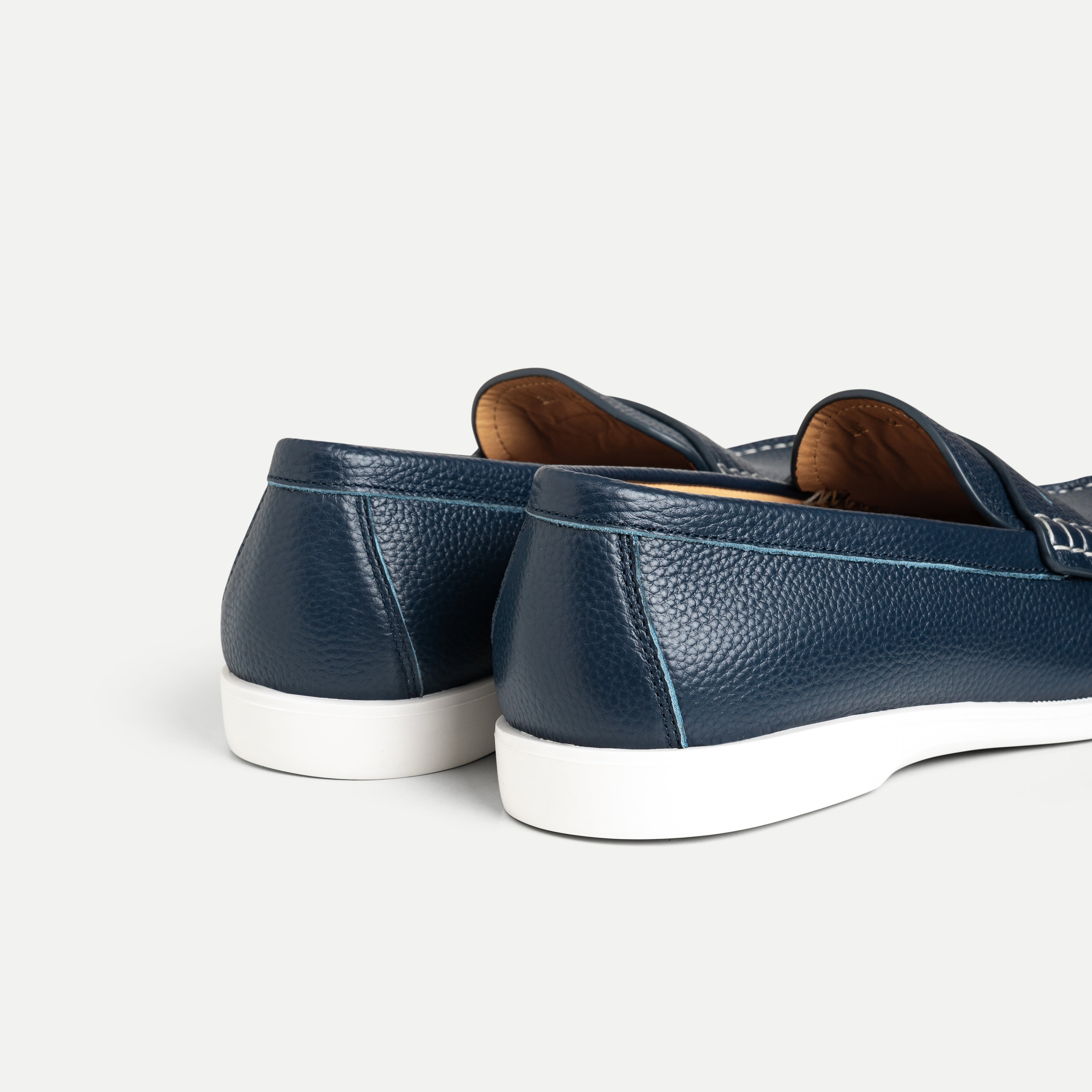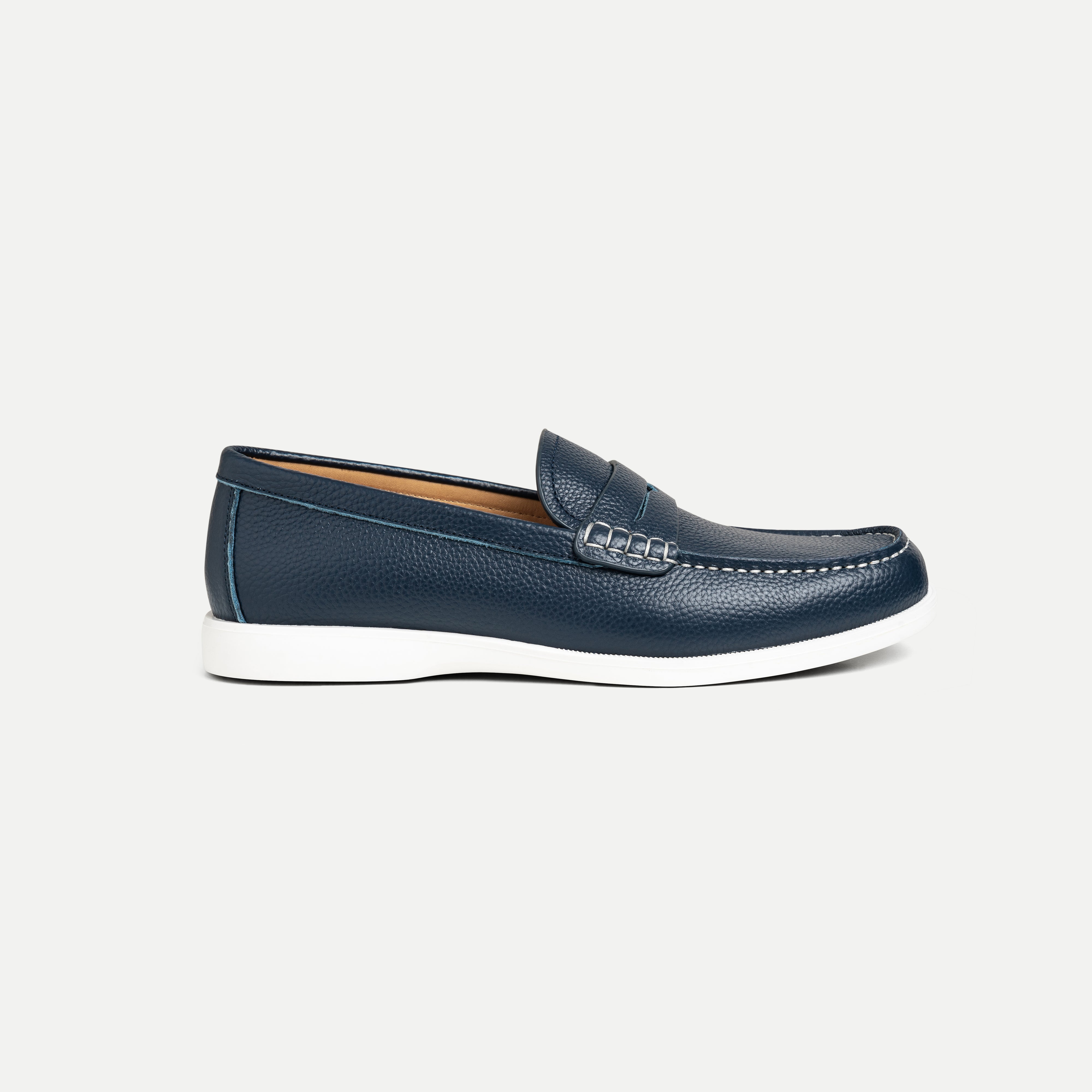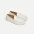The Leather Moccasin Shoe features a refined silhouette crafted from soft, smooth leather, highlighted by a rounded toe and carefully finished stitching. A decorative loafer-style lace detail and a clean white rubber sole add a modern, sophisticated touch to this timeless design.