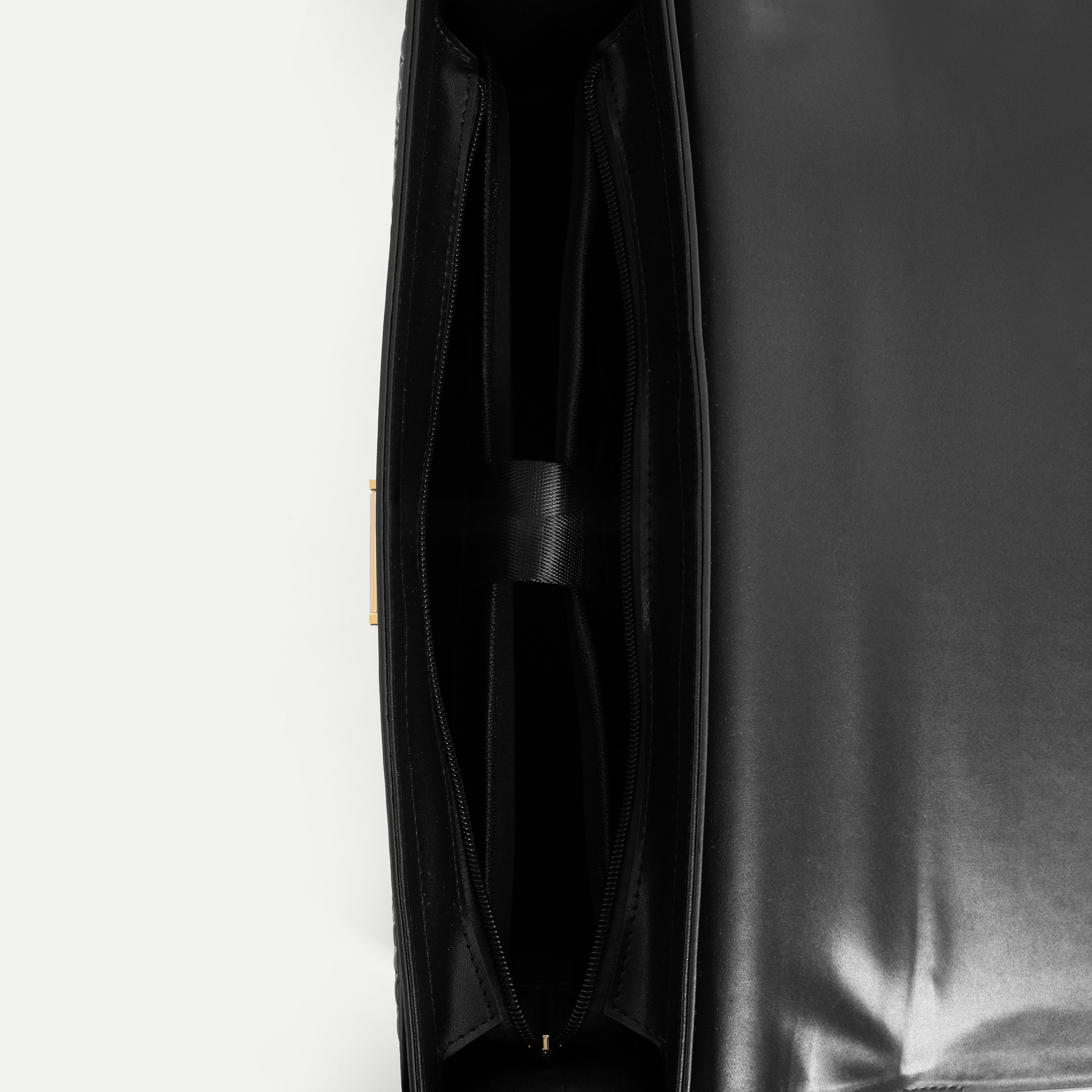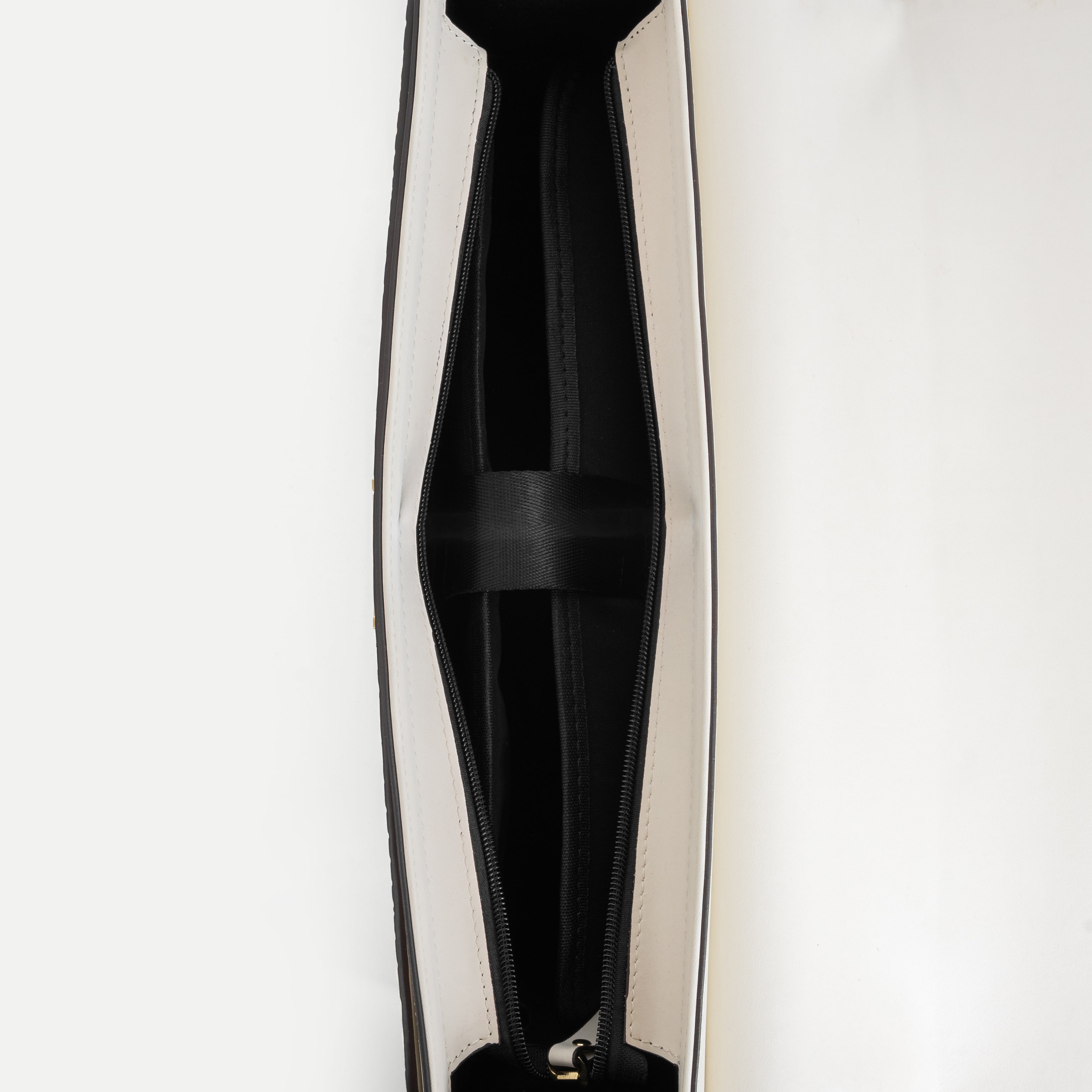 The interior is thoughtfully organized with three evenly divided compartments and a central divider strap, allowing documents and personal items to be stored neatly and accessed with ease. Its balanced proportions and clean lines reflect understated luxury and modern functionality.
