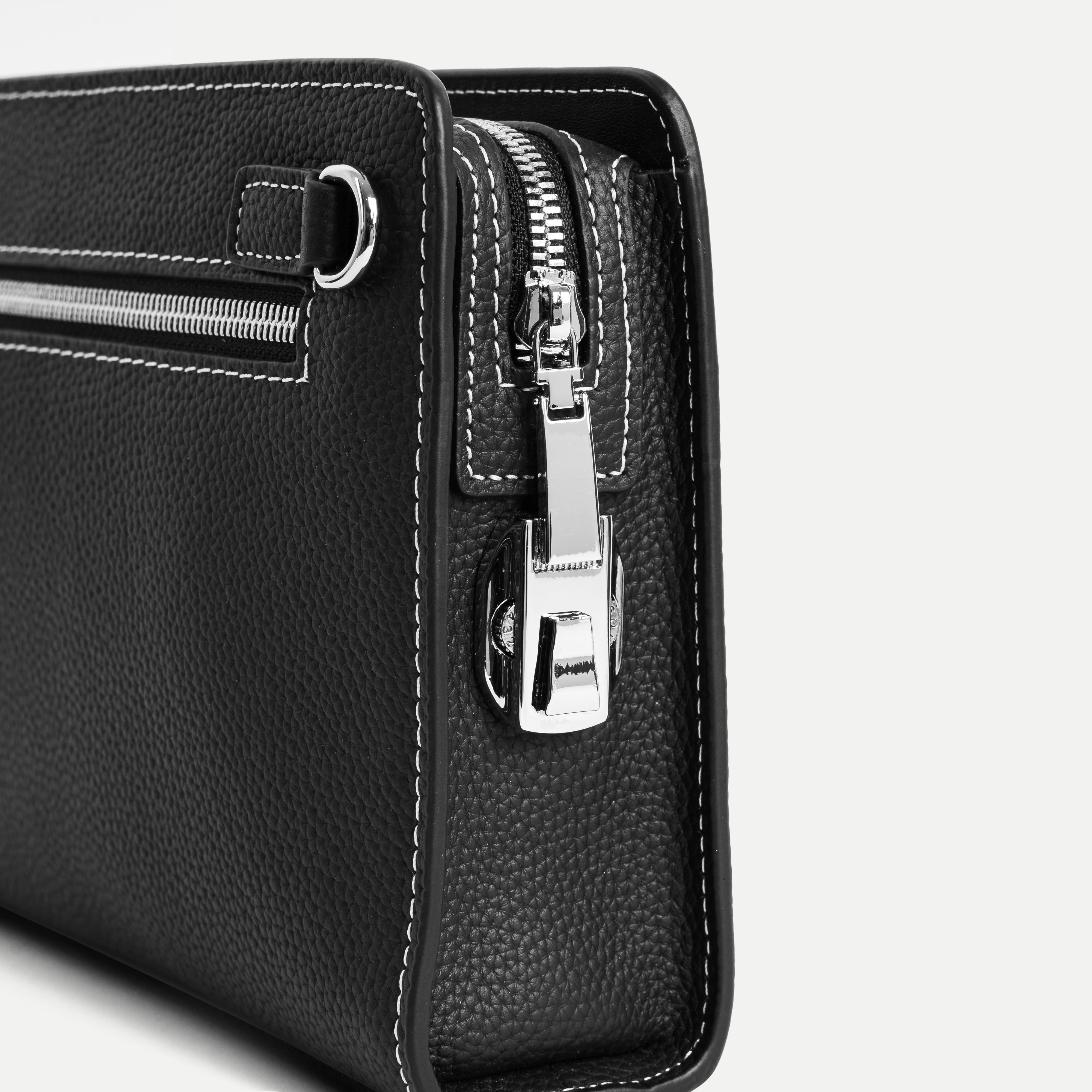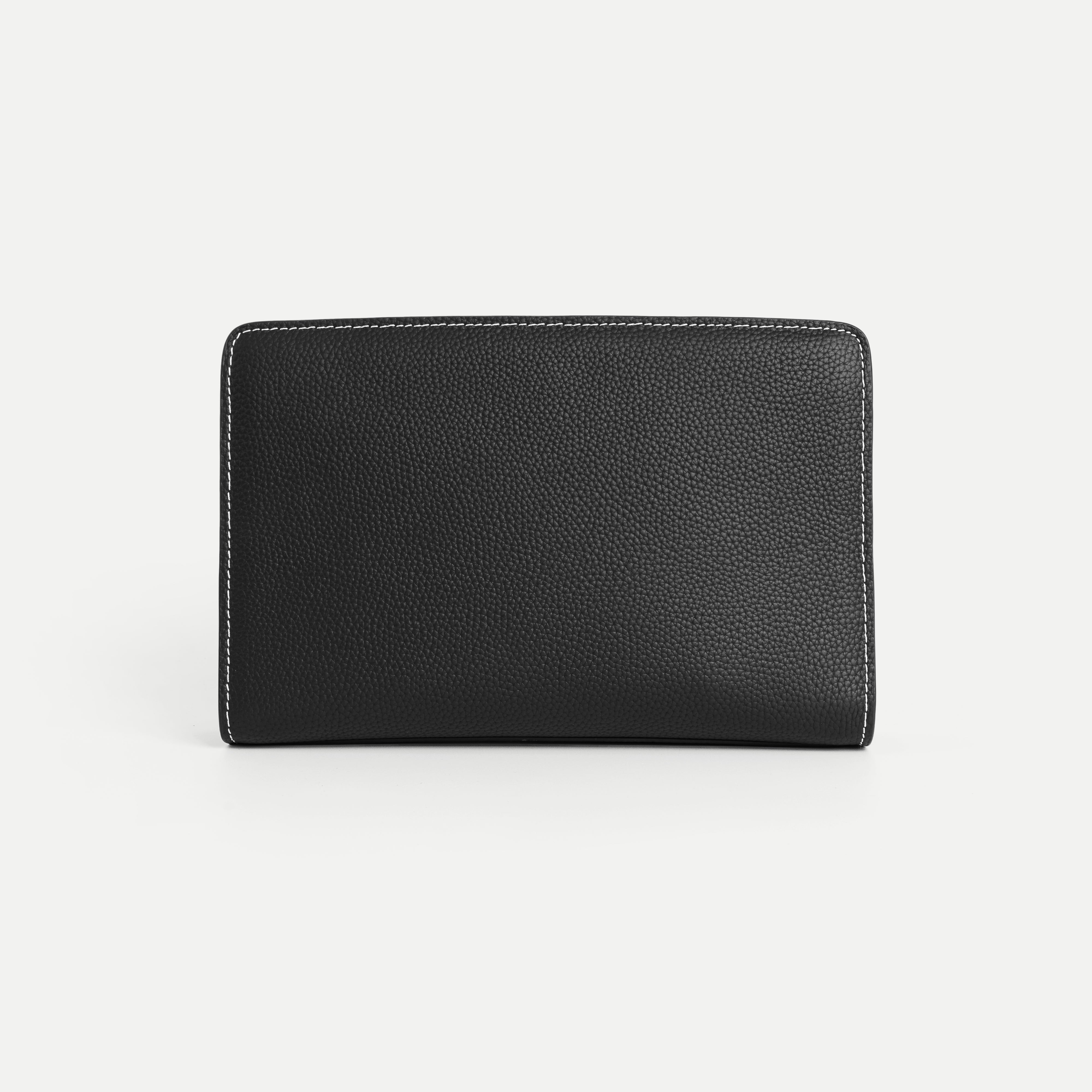 The interior is thoughtfully organized with three evenly divided compartments and a central divider strap, allowing documents and personal items to be stored neatly and accessed with ease. Its balanced proportions and clean lines reflect understated luxury and modern functionality