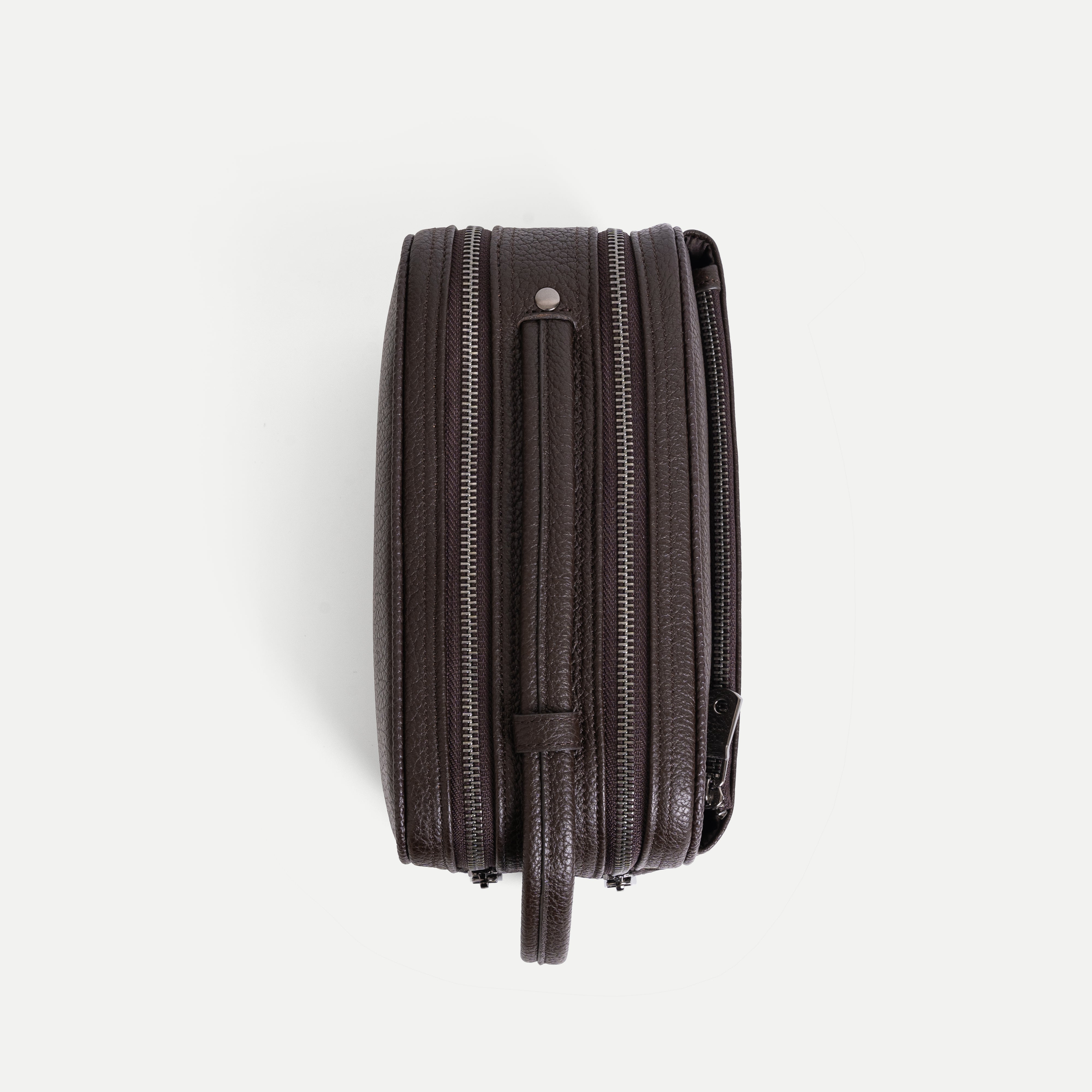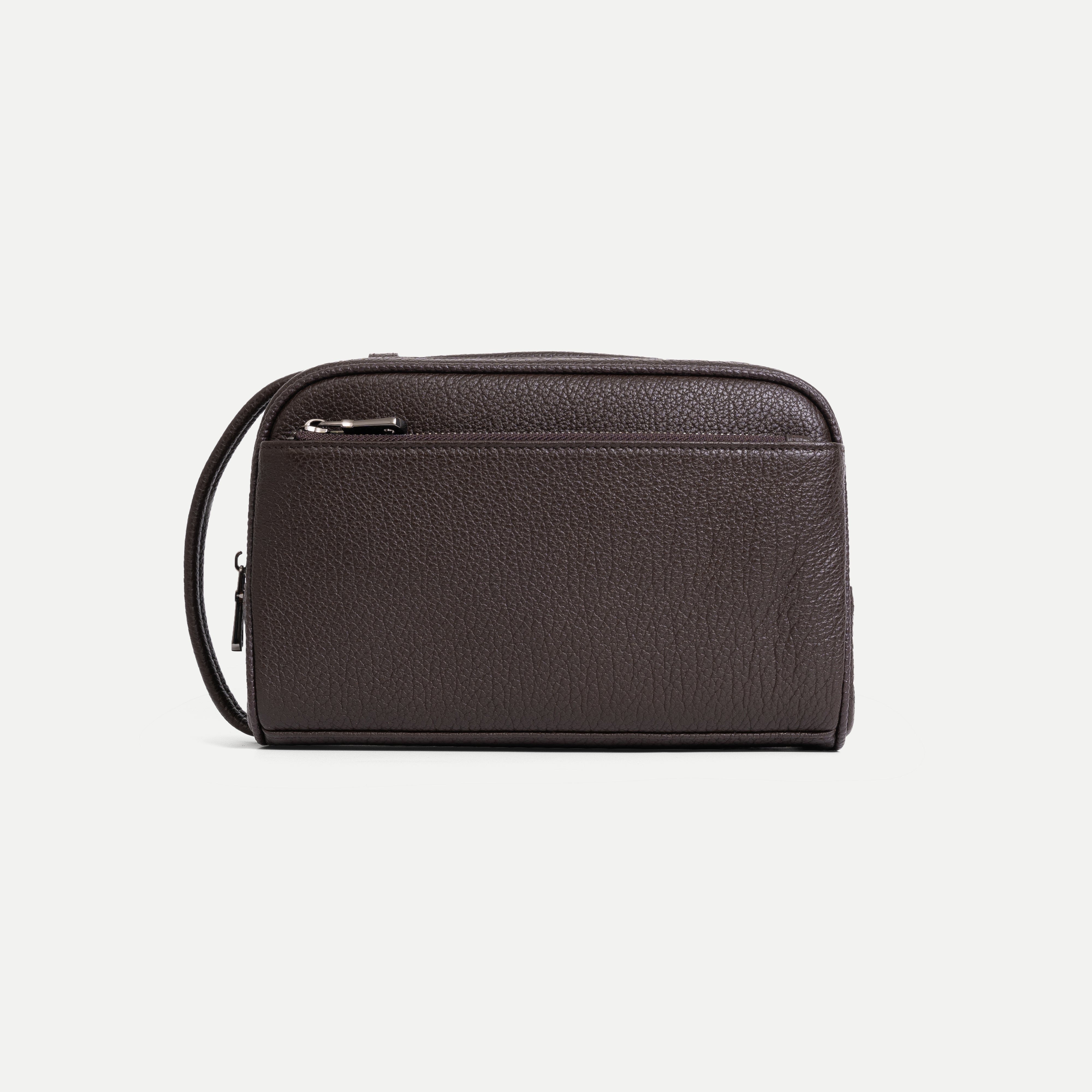 The Textured Leather Clutch Bag features a refined, structured design with two main compartments and an additional inner pocket, all secured with smooth, durable metal zip closures. Designed in a medium-sized horizontal clutch silhouette with softly rounded rectangular edges, it offers a clean, modern look that is both practical and elegant.