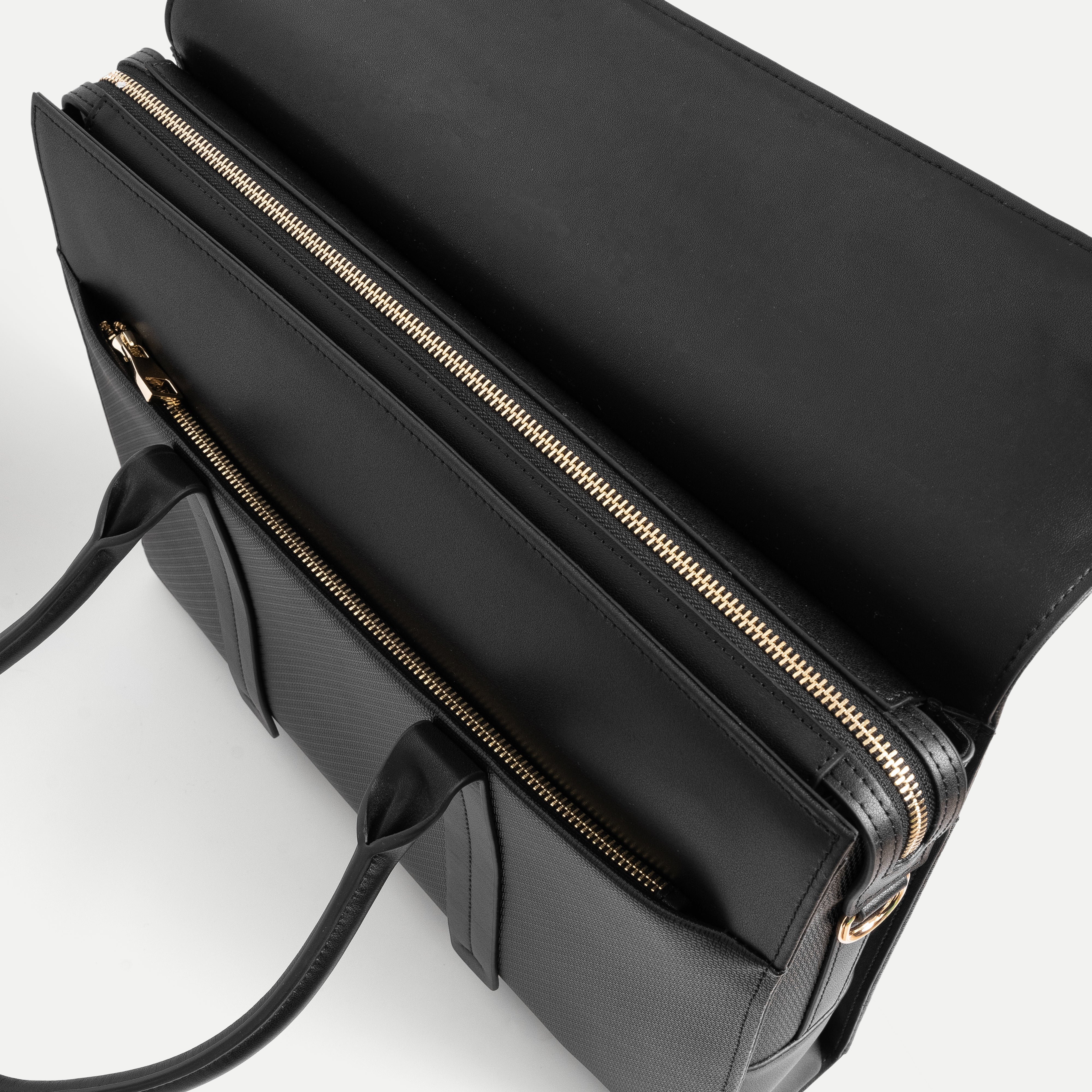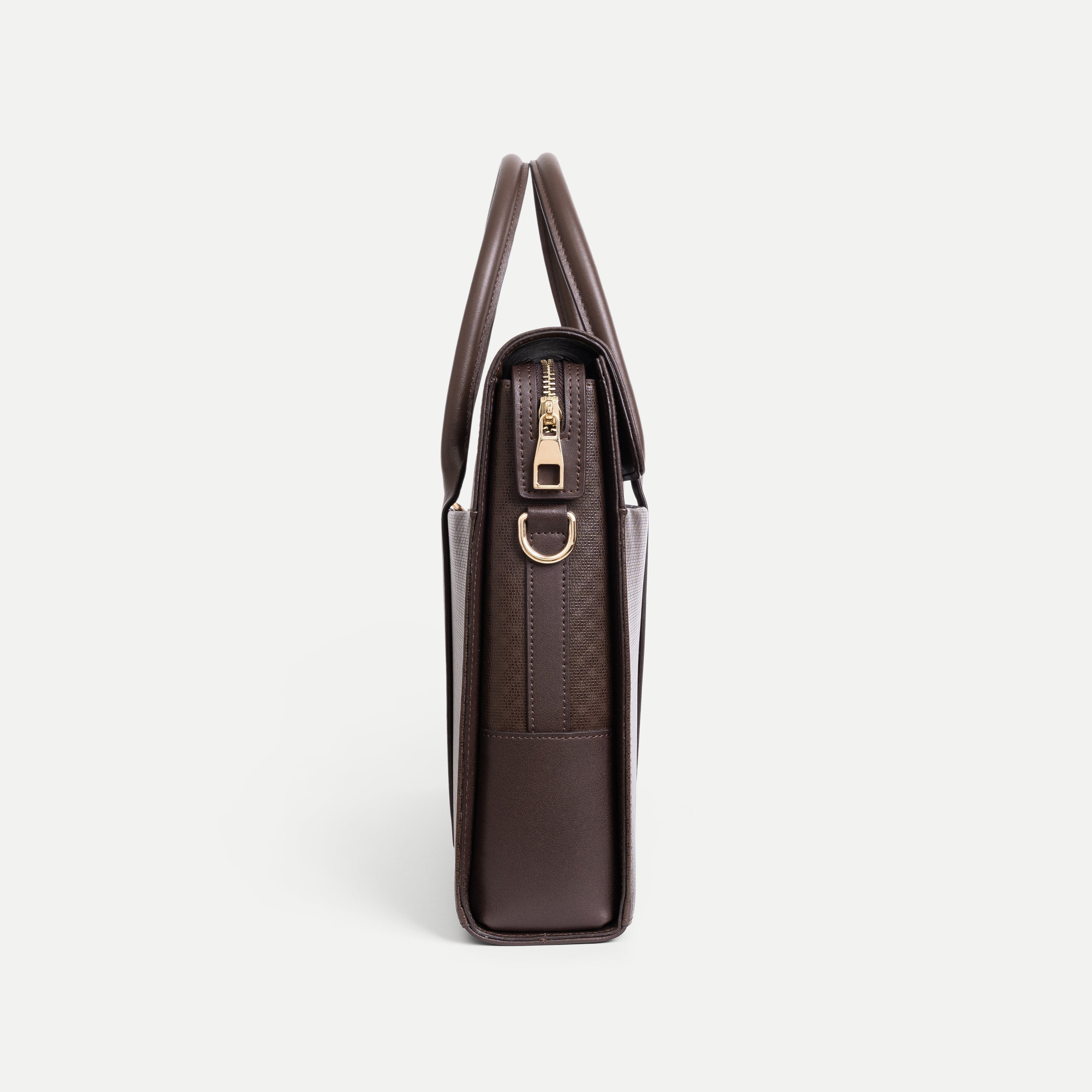 Designed with a sturdy top handle, the briefcase ensures comfortable hand-carrying while enhancing durability and overall aesthetics. Inside, three evenly divided compartments with a central divider strap provide organized storage, making it well suited for professionals who value order, mobility, and understated elegance.